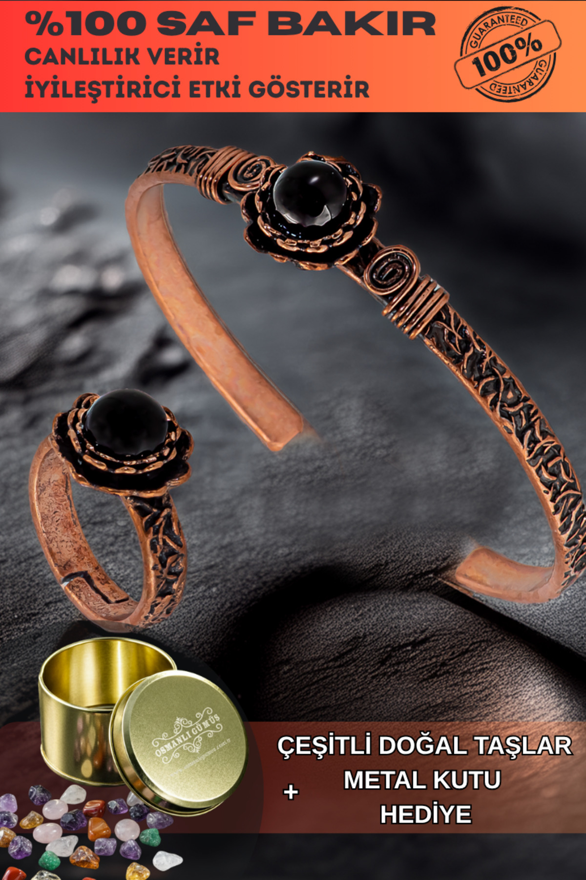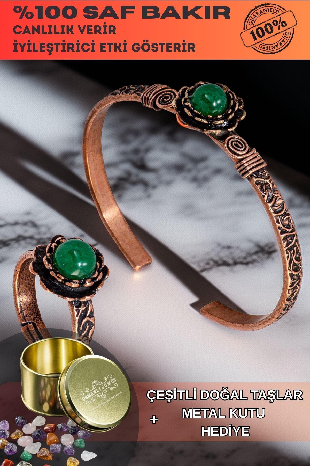 Kadın Bakır Bileklik Yüzük Set - Mistik Topaz Taş Mekik Ağaç Kabuğu Model İnce Metal Kutu Doğal Taş