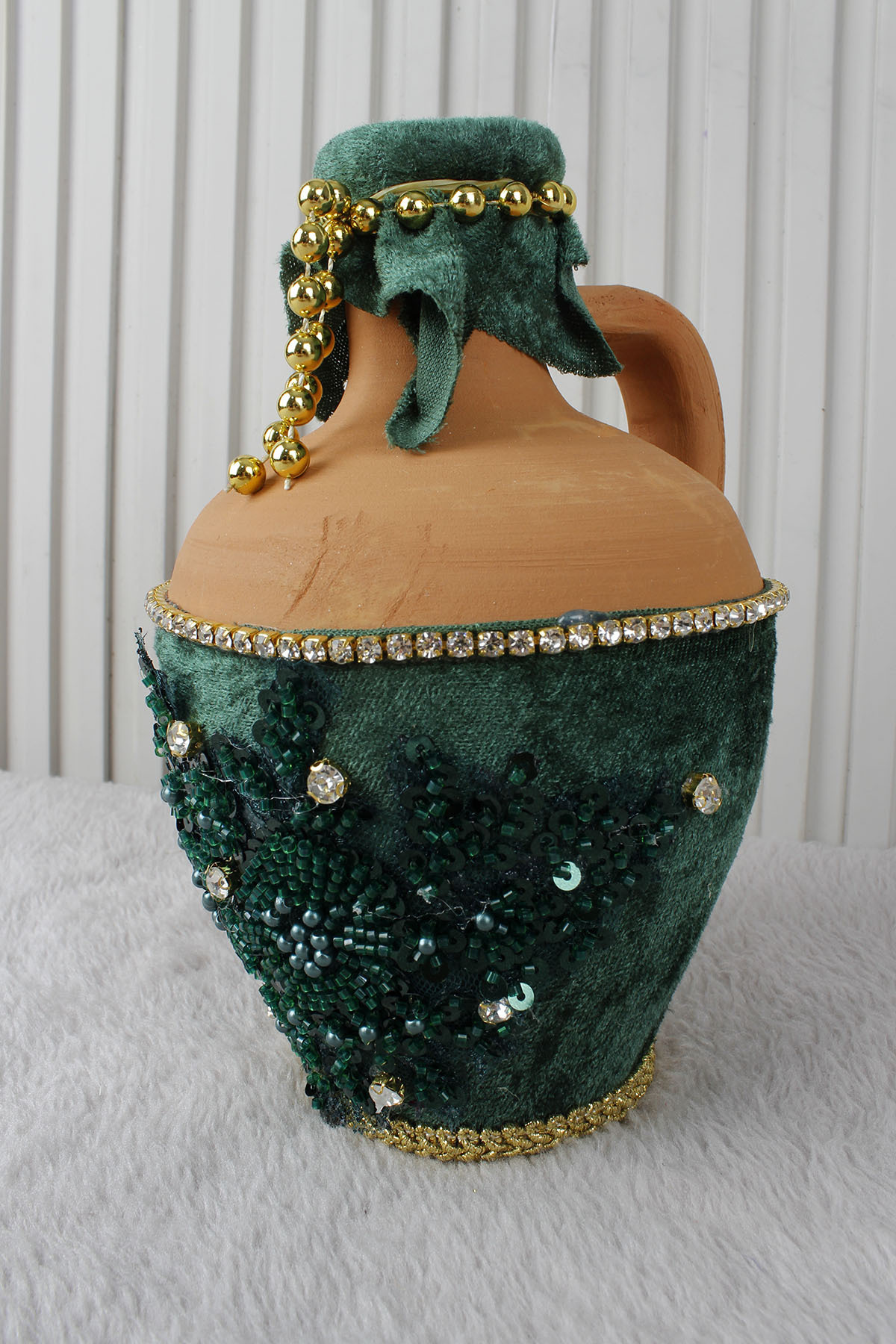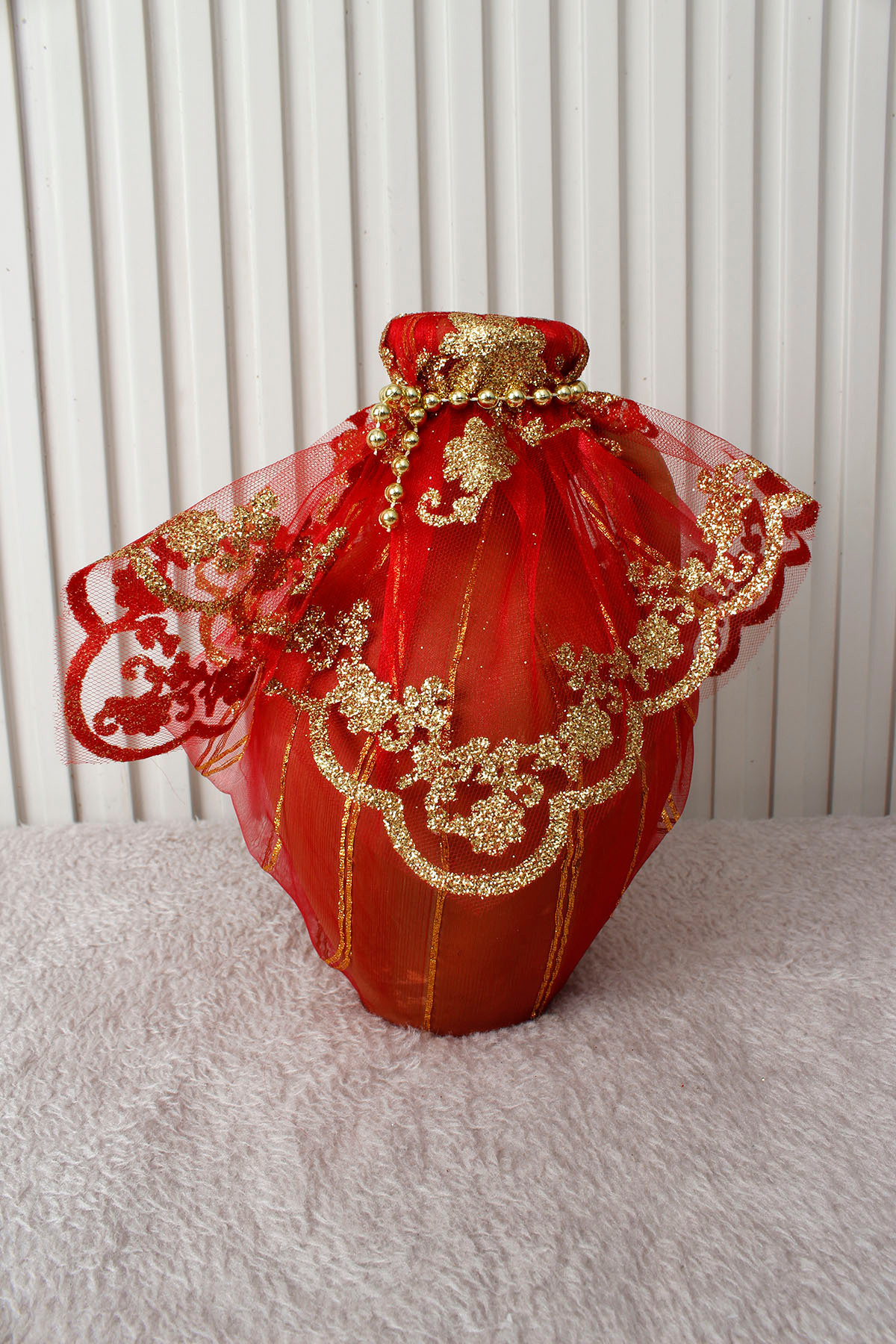 Gelin ve damadın kına gecesi ritüellerinde kullanılan kırmızı süslü kına testisi, geleneksel toprak yapısıyla dikkat çeker.