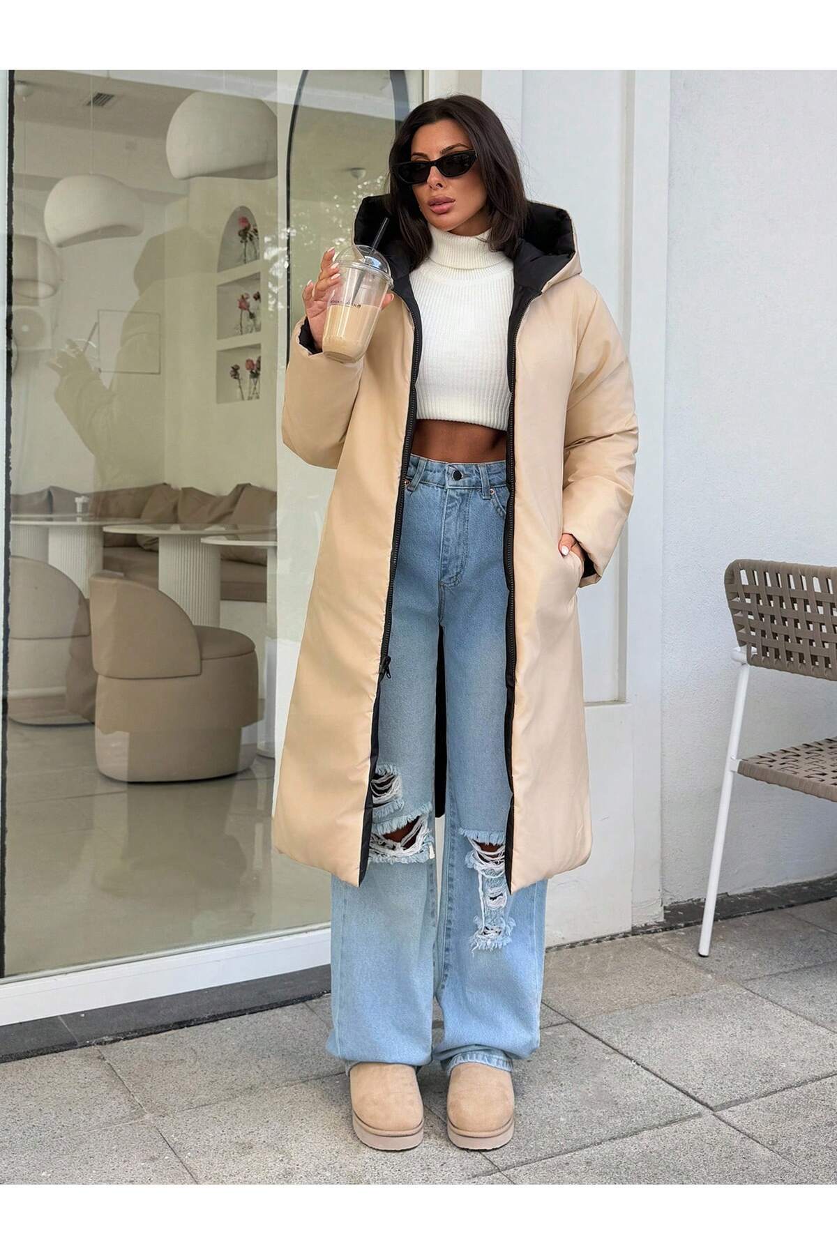 - İki farklı tarafa sahip, şıklığı ve işlevselliği bir arada sunan siyah beyaz mont.