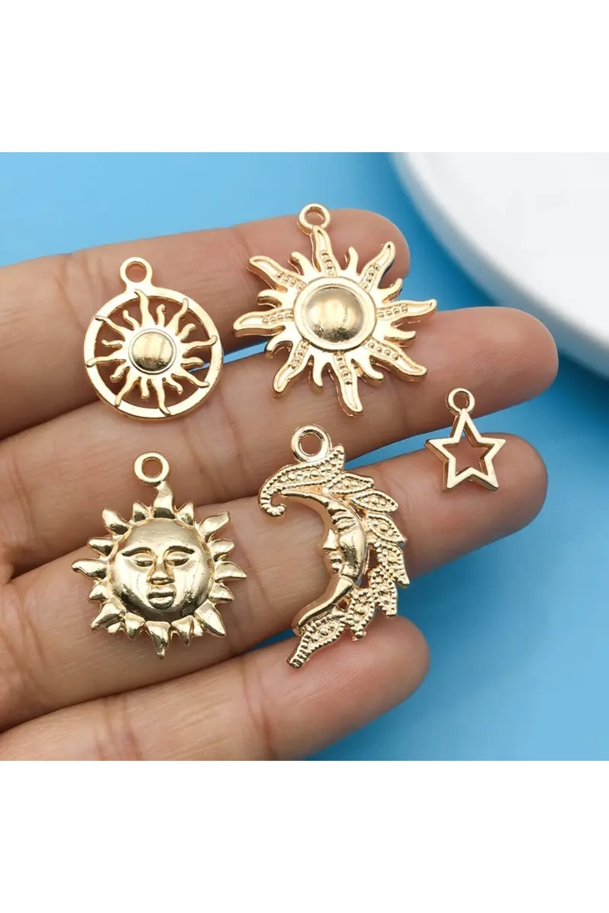 Altın Renk Ay Güneş Yıldız Figürlü 10 adet Takı Yapımı Kolye Ucu Charm Seti