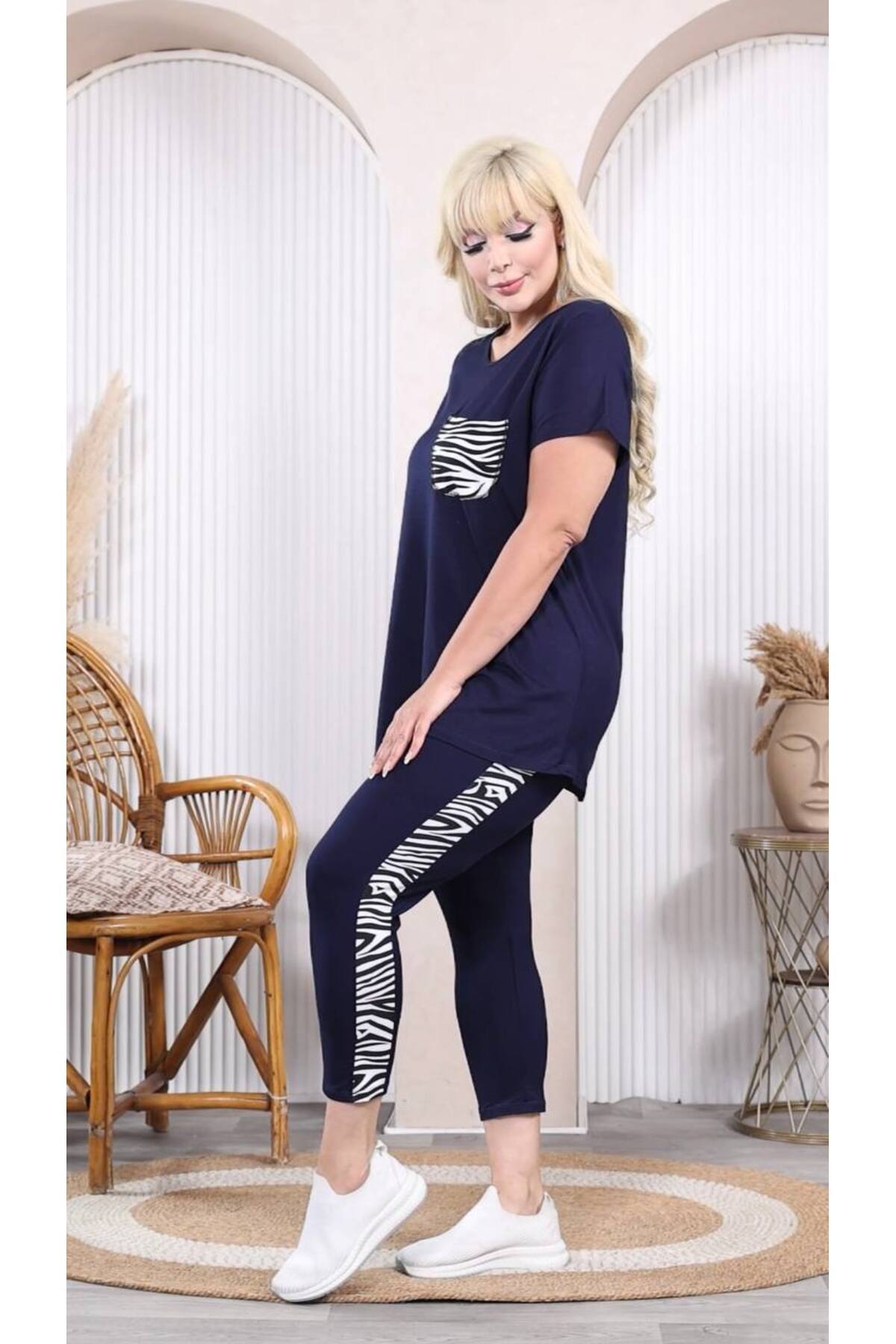 - Rahatlık ve şıklığı bir arada sunan lacivert kapri takım, günlük kullanım için idealdir.