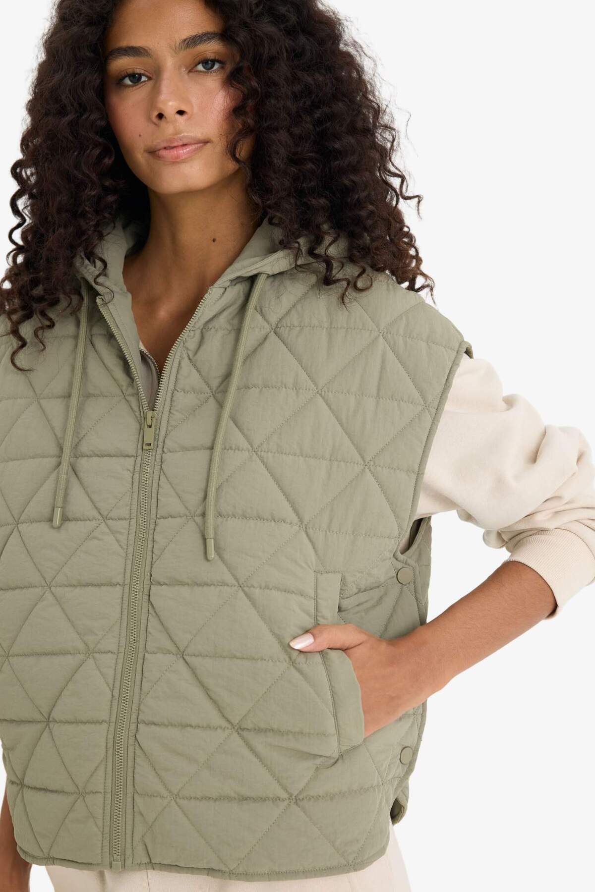 Relax fit kapüşonlu kapitoneli fermuarlı yelek, hafif ve koruyucu yapısıyla serin havalarda ideal bir tamamlayıcıdır.