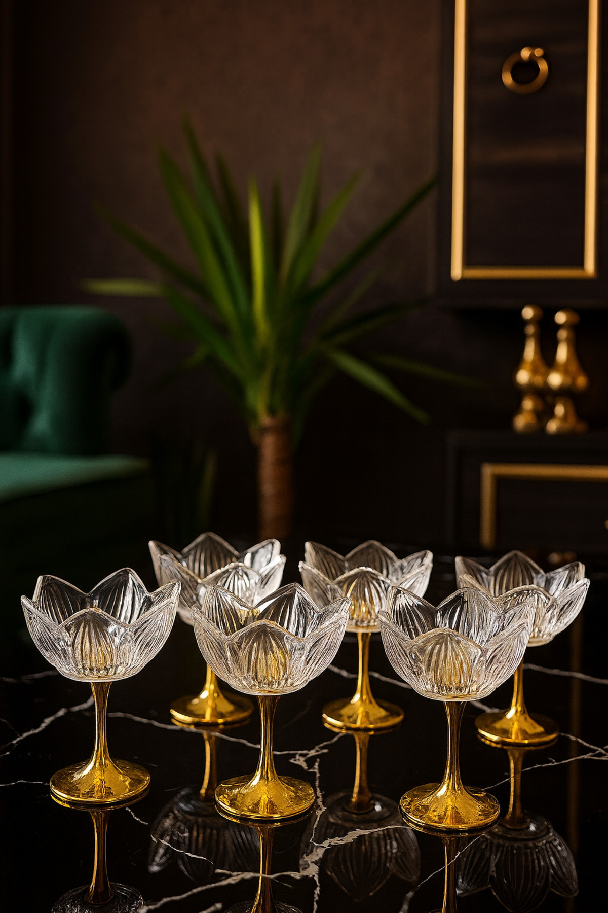 Öne Çıkan Özellikler: 6 adet gold ayaklı kristal kase Şık çiçek formunda tasarım Kahve yanı ikramlar ve atıştırmalık sunumları için ideal Lüks ve modern dekoratif görünüm Yüksek kaliteli kristal cam malzeme