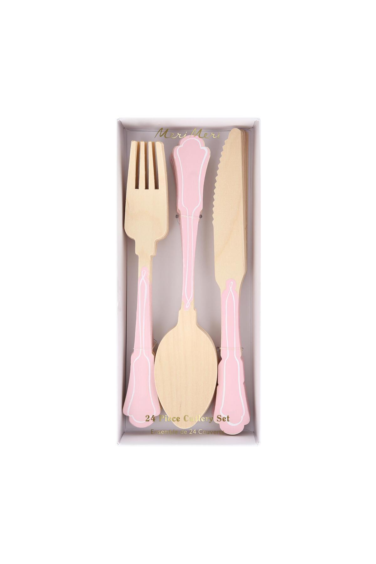 - Ahşap Çatal-Kaşık-Bıçak Set - Pembe Çizgili - 24 Adet