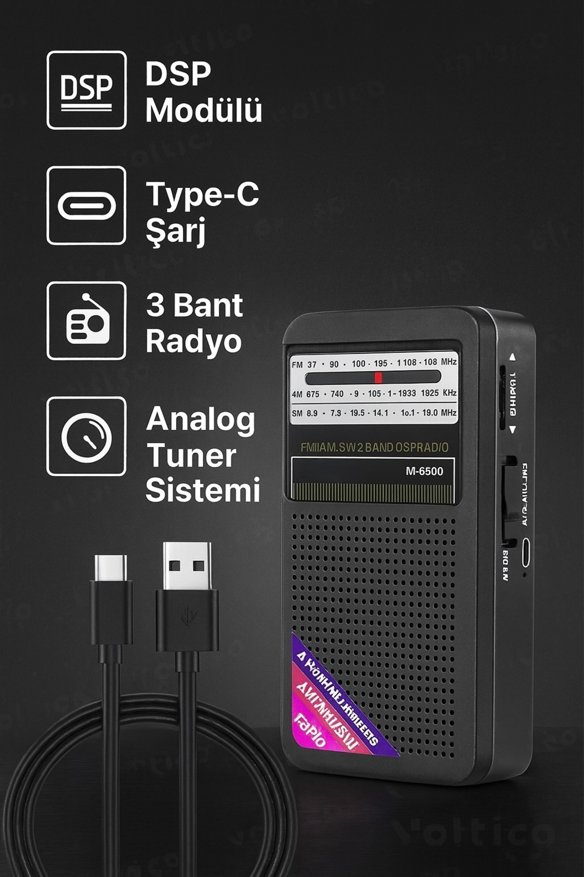 Özellikler:•FM/AM/SW 3 Bant Desteği: Geniş frekans aralığında yayın dinleme imkanı•Type-C Şarj: Hızlı ve pratik şarj teknolojisi•DSP Modülü: Net ve kaliteli ses•Kompakt ve Hafif Tasarım: Cepte, çantada kolay taşıma•Acil Durum Kullanımı: Deprem, sel ve afetlerde kesintisiz bilgi alma•Dahili Hoparlör: Yüksek ses kalitesi•Enerji Verimliliği: Uzun pil ömrü ile gün boyu kullanımGünlük yaşamda müzik keyfi, acil durumlarda hayat kurtaran bilgi kaynağı!