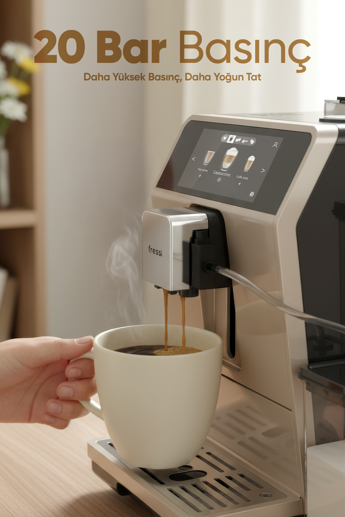 Fressi EM-1592 Coffero Tam Otomatik Espresso Makinesi☕✨ Barista kalitesinde kahve şimdi tek dokunuşla evinizde! 🏡💎 💡 4.5 inç TFT Dokunmatik Panelile 24 farklı içeceği kolayca seçin, damak zevkinizi kişiselleştirin.