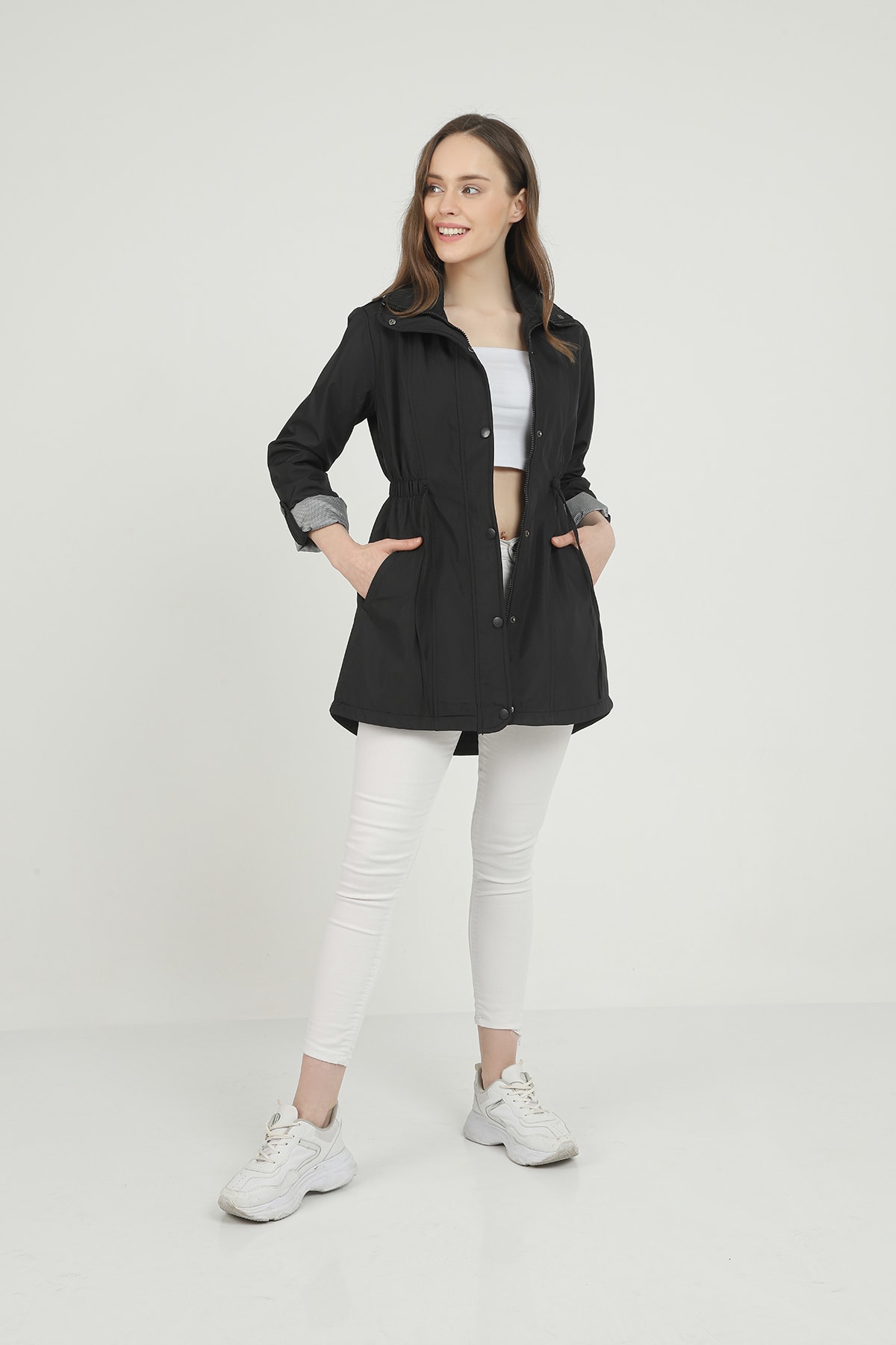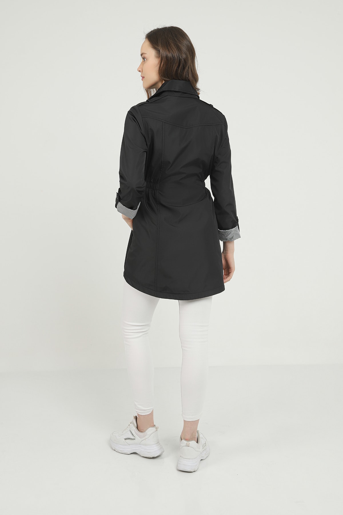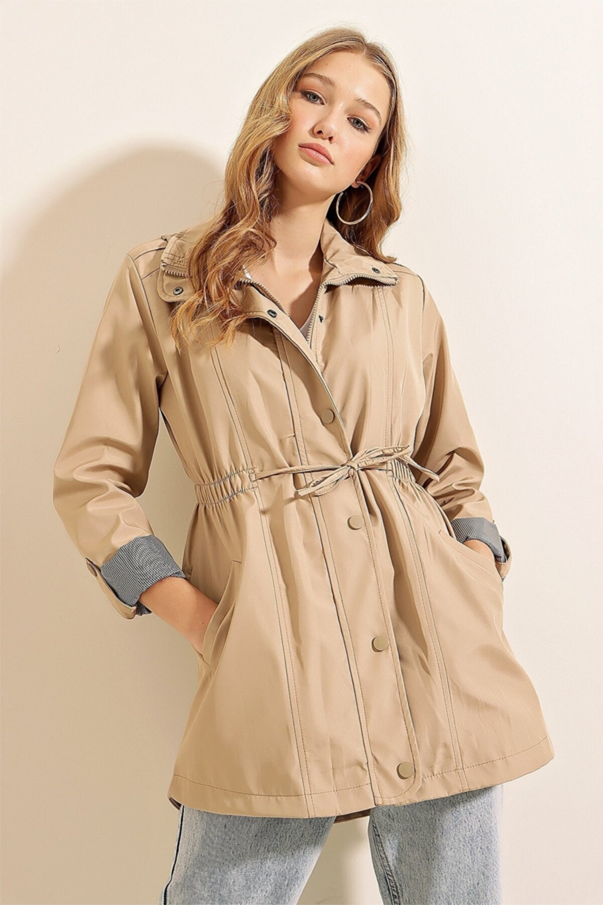 Gömlek yakası detayı ile klasik trençkot görünümünü modernize eder