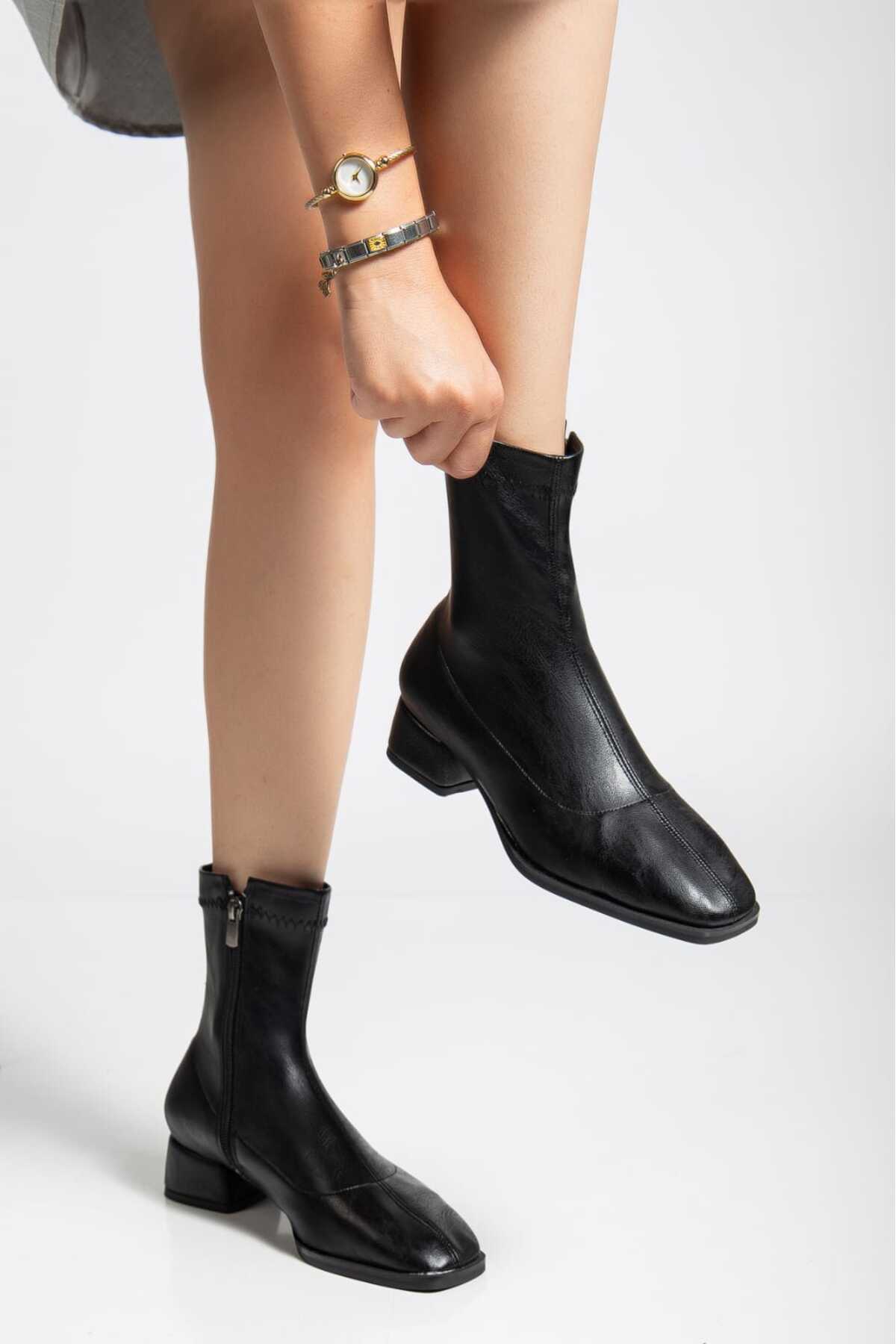 Frosty Alçak Topuklu Tpu Taban Siyah Cilt Küt Burunlu Yandan Fermurarlı Streç Bot