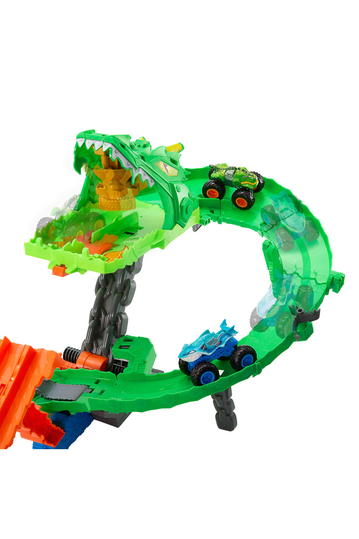 • Köpek Balığı ve Dinozor Korkunç Ejderhaya Karşı oyun setinde, Hot Wheels Monster Trucks köpek balığı ile dinozor kötü ejderhayı yenmek için yarışıyor. Sete dahil oyuncak kamyonları çift şeritli çembere yerleştirip sayborg ejderhanın ağzından geçecekleri yan yana bir yarışa gönderin. Kamyonlar yarışırken ejderhanın ağzından gövdesine ilerler. Testereli yönlendiricide onları üç sonuç bekler: İki kamyonun da geçmesine izin vermez, birini pistten atar veya ikisinin de kaçarak kötü ejderhayı yenmesine izin verir. Ejderha yere kapaklandığında çocuklar, kamyonları ağzına gönderip kupayı ele geçirebilir. 2 adet 1:64 ölçekli Hot Wheels Monster Trucks dahildir. Renkler ve süslemeler çeşitlilik gösterebilir.