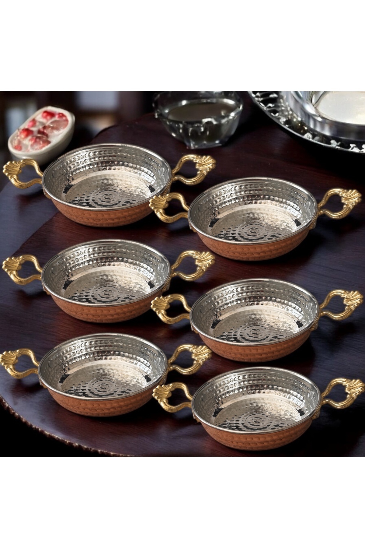 Kahramanmaraş el işçiliği içleri kalaylı bakır sahanlar 6 lı takımEbat : 11 cmElde yıkamaya özen gösterin.