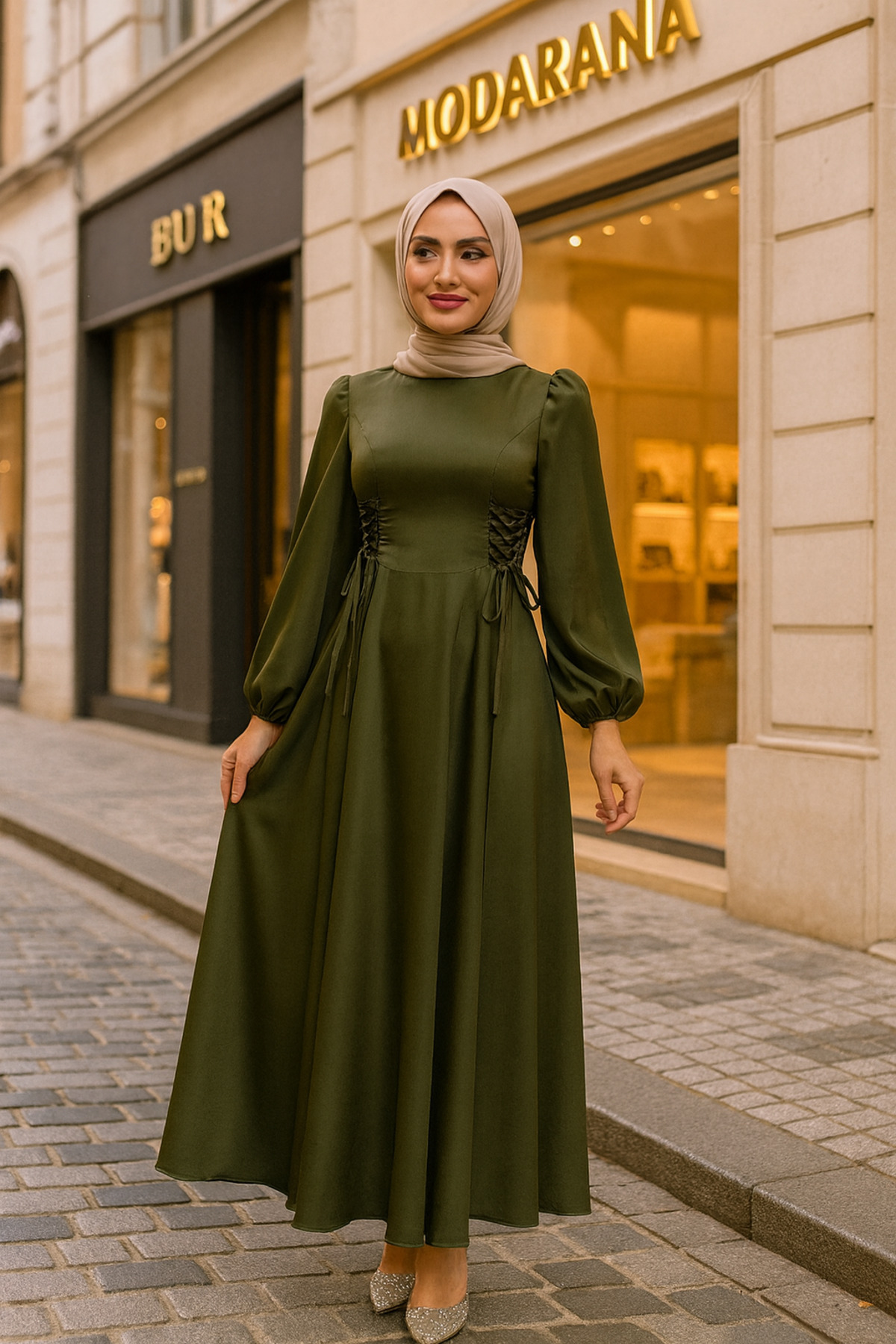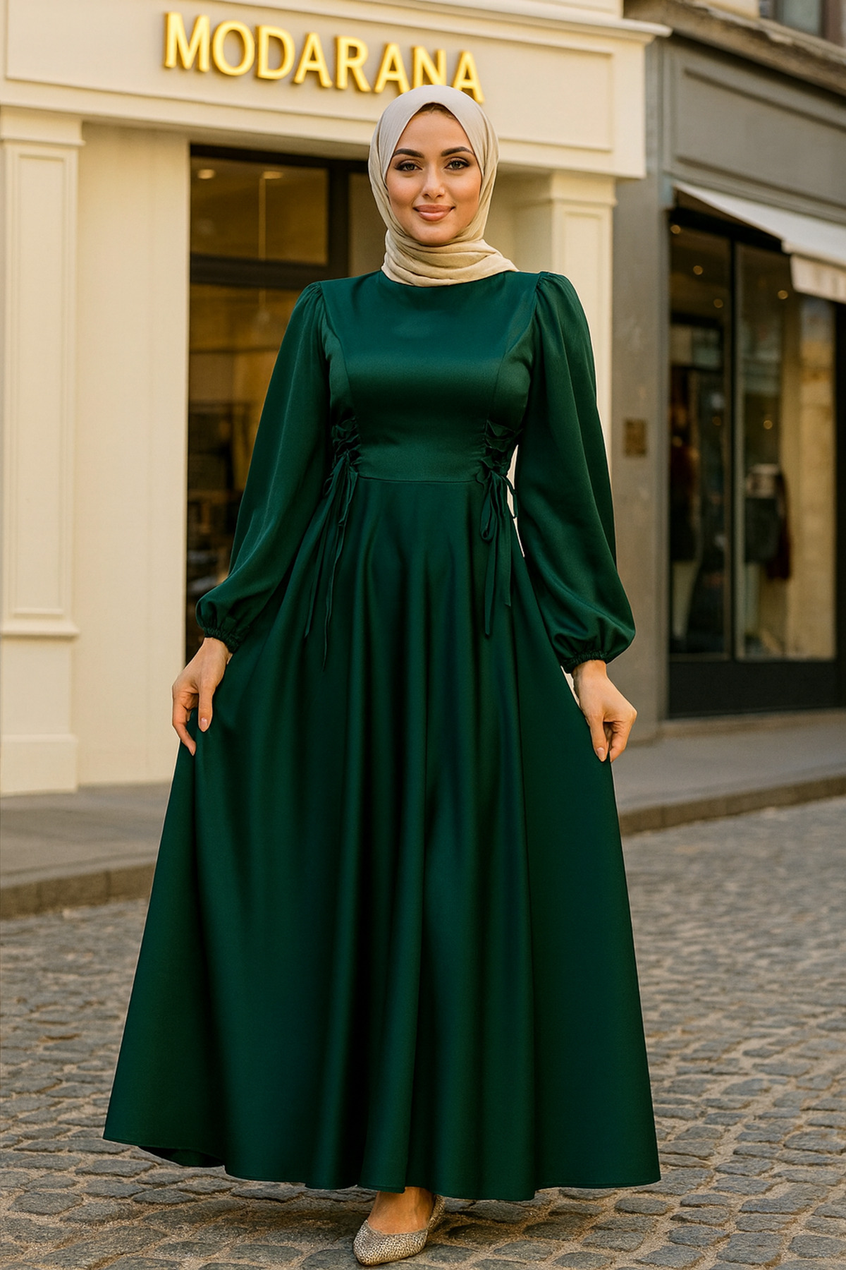 Belden Bağlamalı Balon Kol Saten Tesettür Abiye