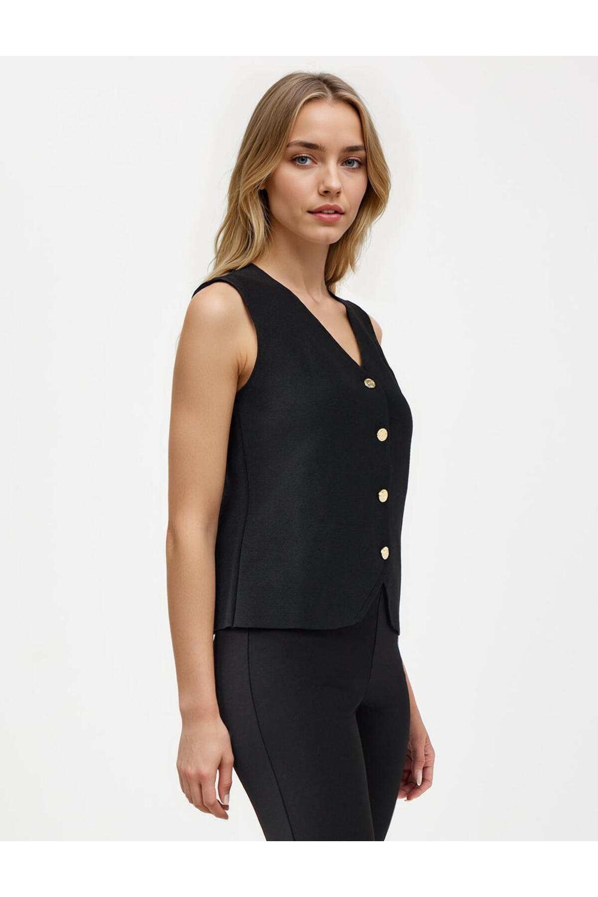 Siyah Dar Kesim Parlak Düğme Detaylı Triko Yelek