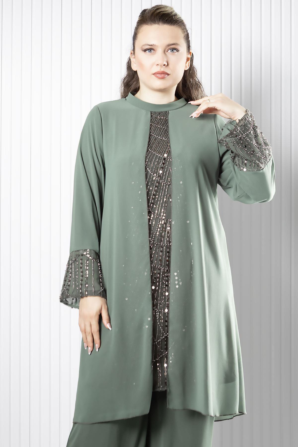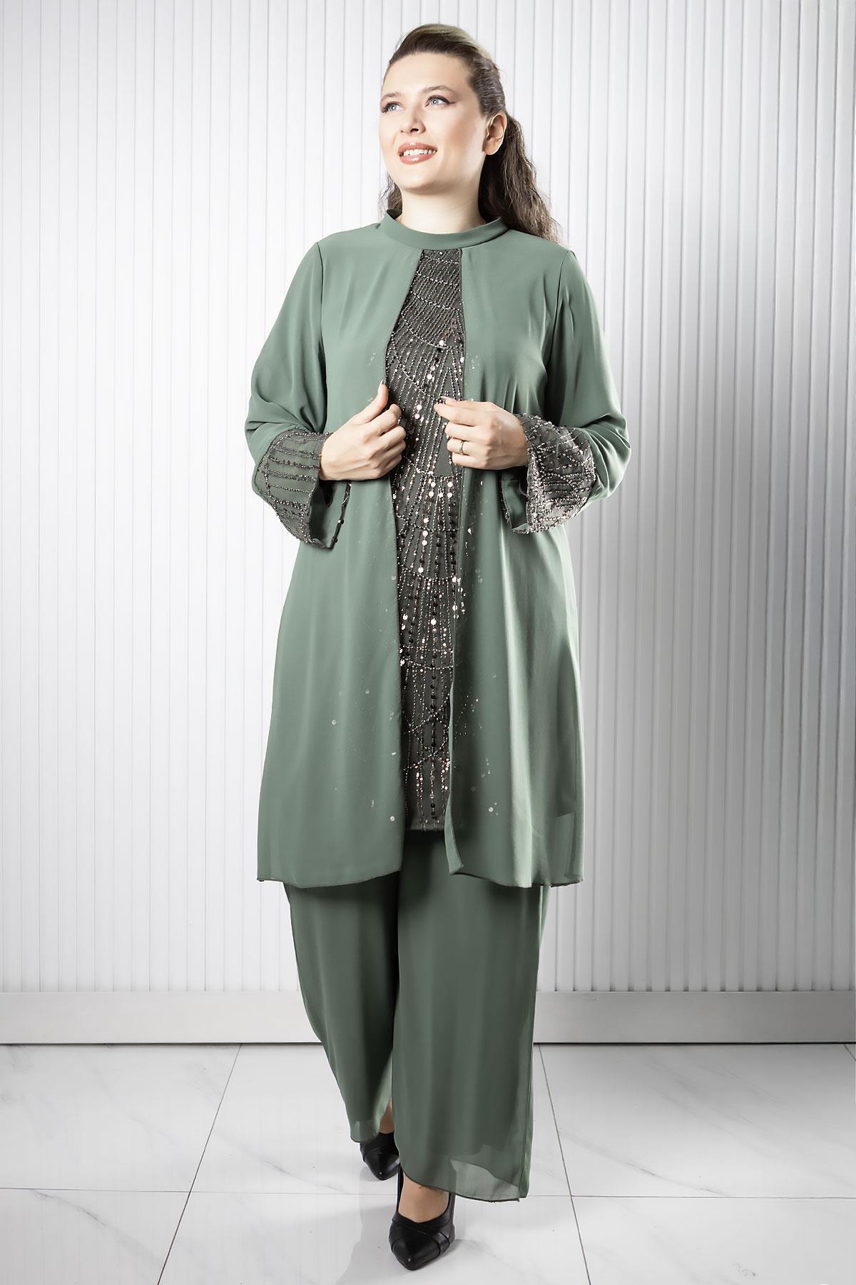 - Şık ve zarif tasarımıyla dikkat çeken bu büyük beden tesettür abiye bluz pantolon takımı, her ortamda göz alıcı bir görünüm sunar.