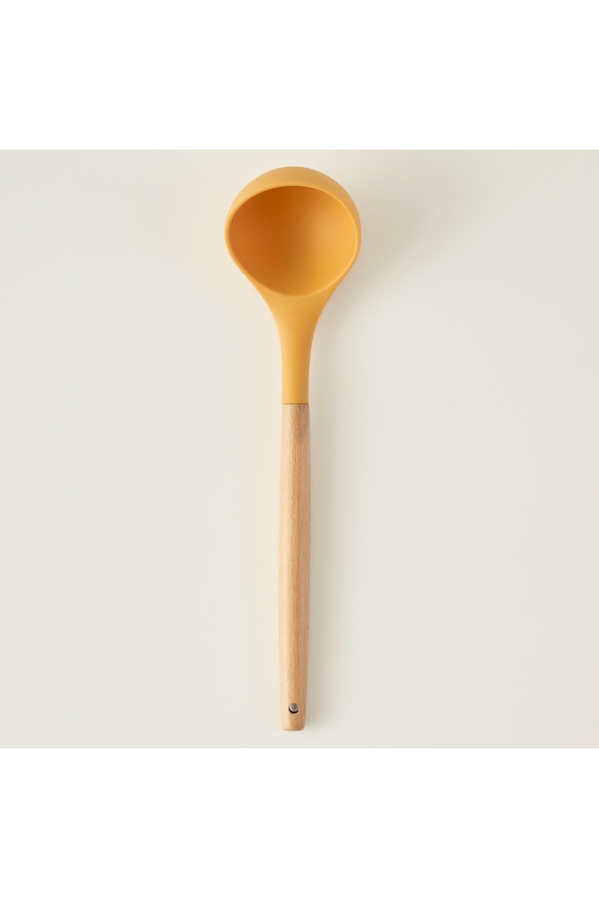 Makarna kepçesi, çorba kepçesi ve spatuladan oluşan 3'lü silikon ahşap saplı servis setidir.