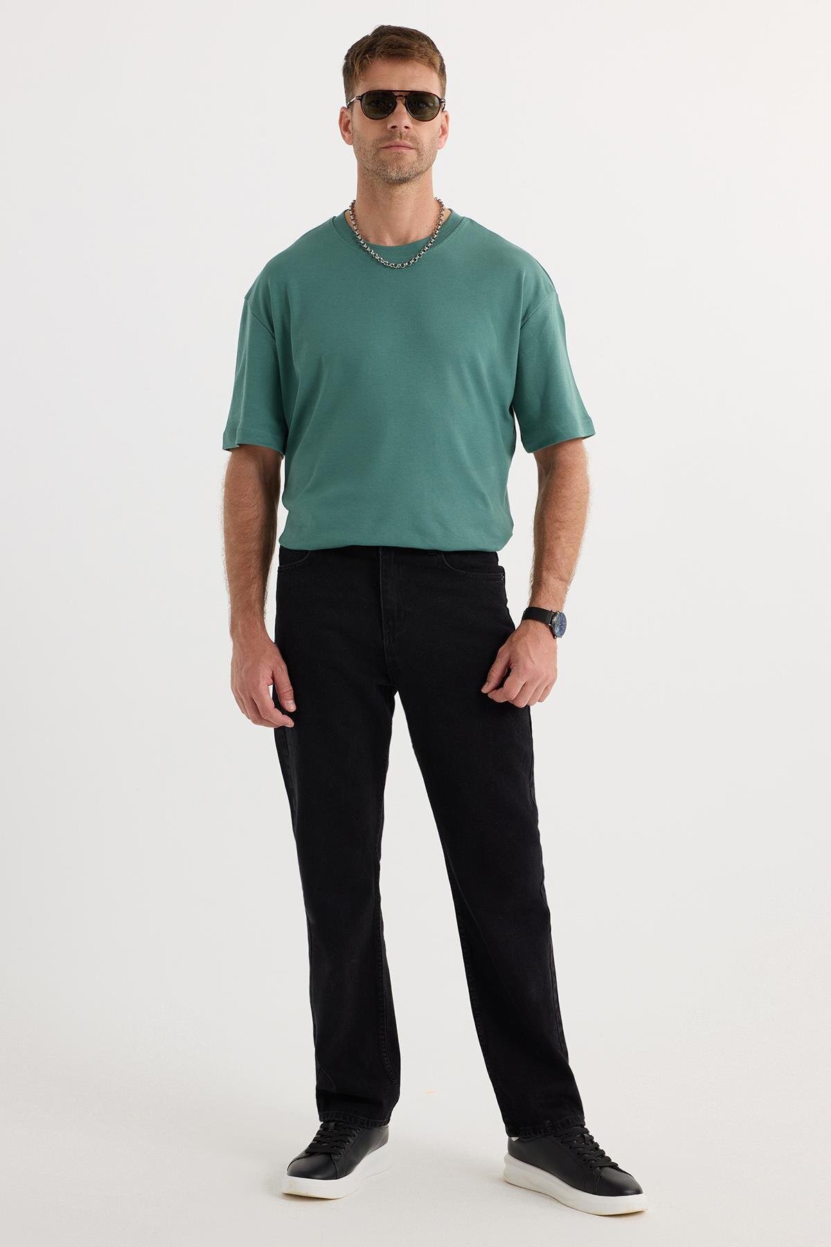Erkek Regular Fit %100 Pamuk Yan Cepli Baggy Siyah Jean Kot Pantolon