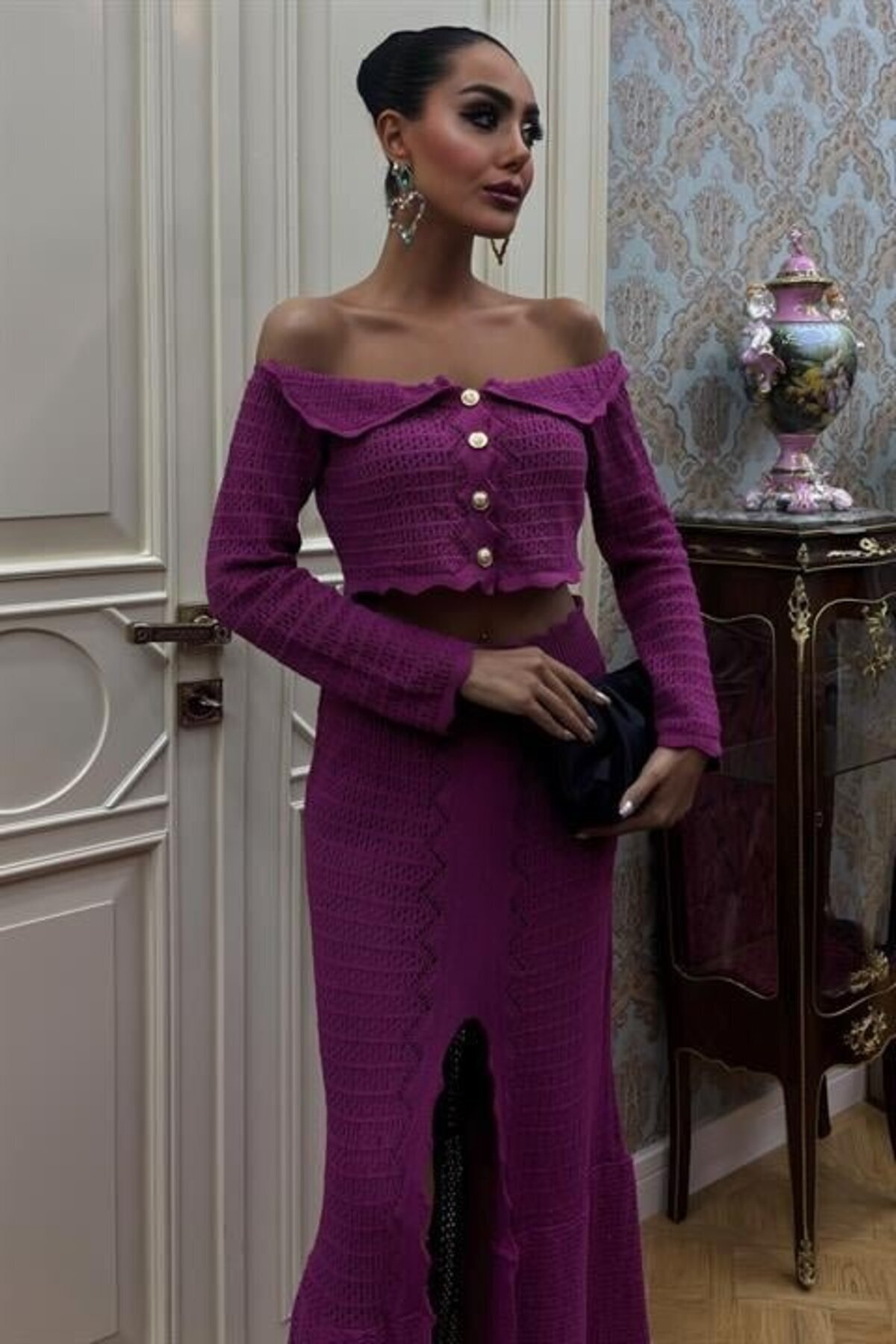Madonna Yaka Derin Yırtmaç Etekli Şık Triko Takım 10099
