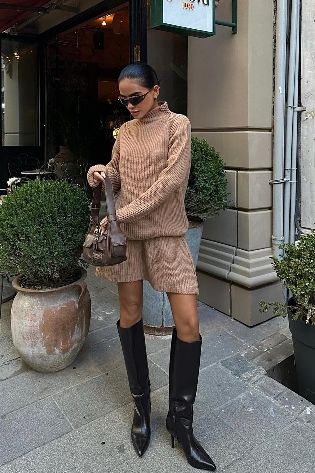 - Camel rengiyle şıklığı ve zarafeti bir arada sunan Ivan Fitilli Dik Yaka Triko Takım, günlük kullanım için idealdir.