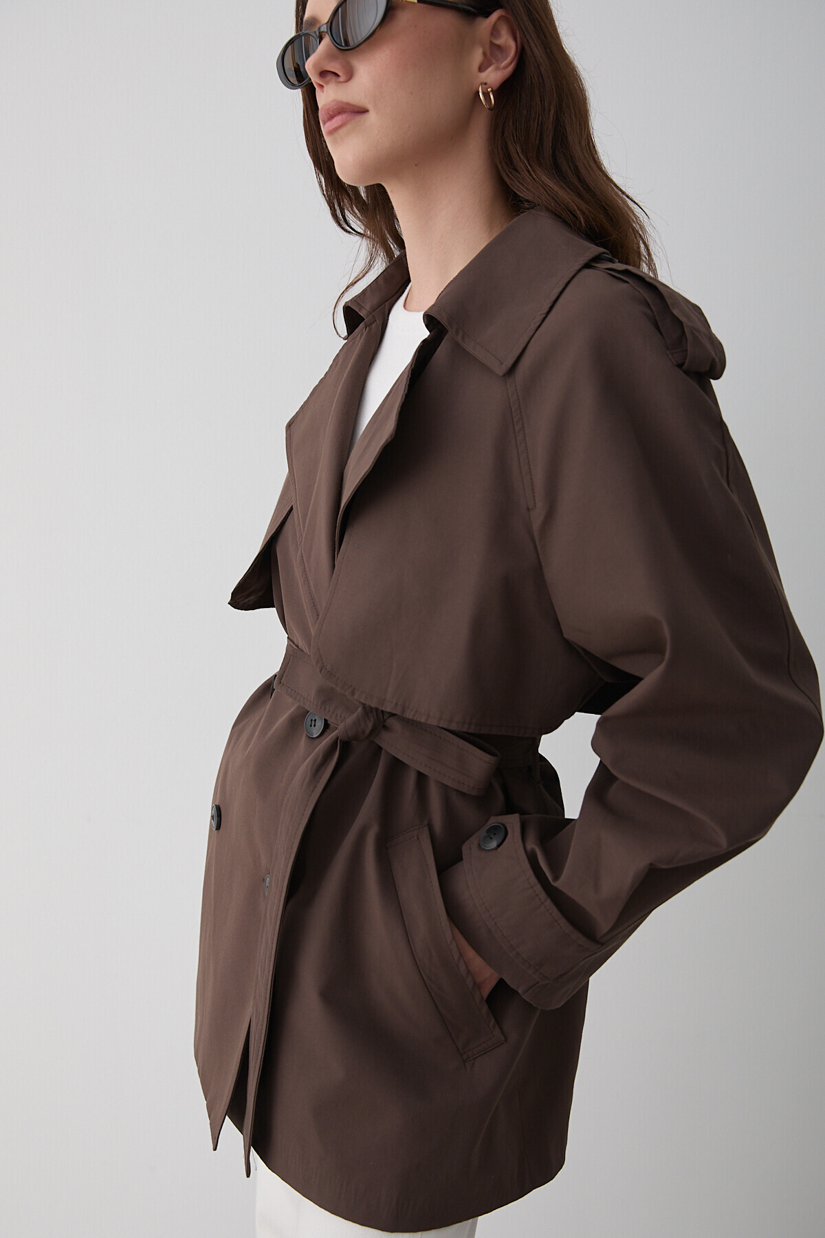 Kahverengi Miyabi Rüzgarlık Detaylı Kuşaklı Kısa Trençkot - 7556