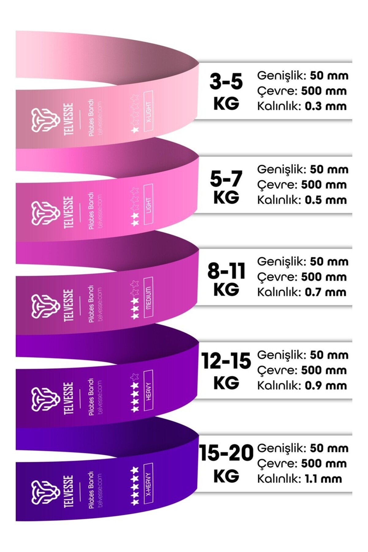 5 farklı direnç seviyesine sahip Pilates Direnç Bandı Seti, tüm vücut egzersizleri için mükemmel bir yardımcıdır.