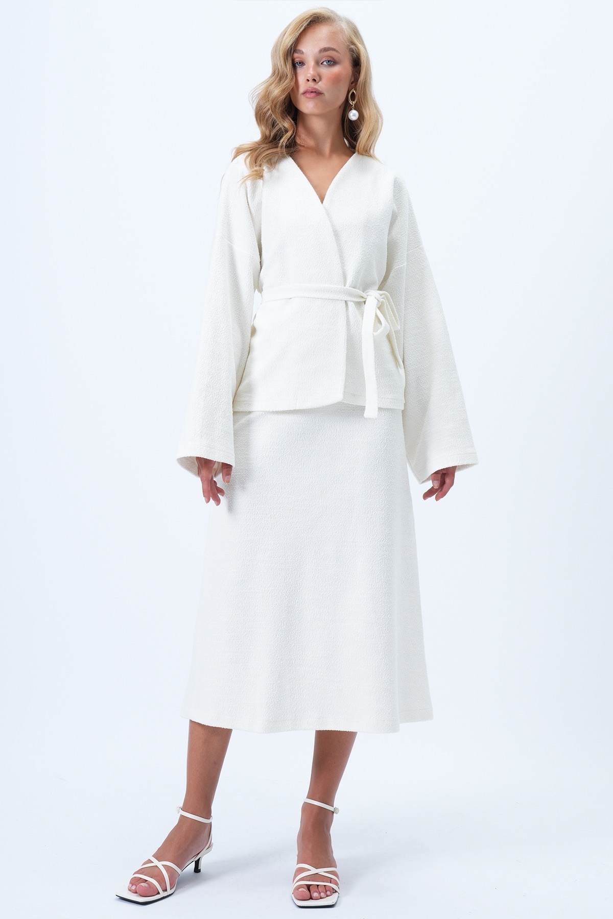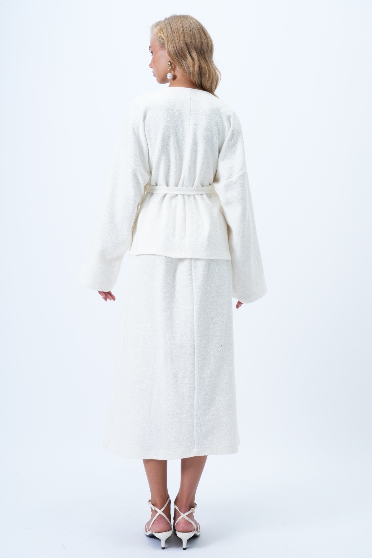Zarif Ve Sofistike Görünümüyle Öne Çıkan İki Parçalı Tweed Takım, Kruvaze Kesim, Kendinden Kemerli Dokulu Ceket Ve Maxi Boy Etekten Oluşuyor. Dokulu Tweed Kumaşı Klasik Bir Şıklık Sunarken, Ceket Tasarımı Feminen Bir Silüet Oluşturuyor. Maxi Boy Etek İse Zarif Duruşuyla Kombini Tamamlıyor. Özel Davetlerden İş Şıklığına Kadar Birçok Ortamda Stilinizi Ön Plana Çıkaracak, Zamansız Bir Takım.