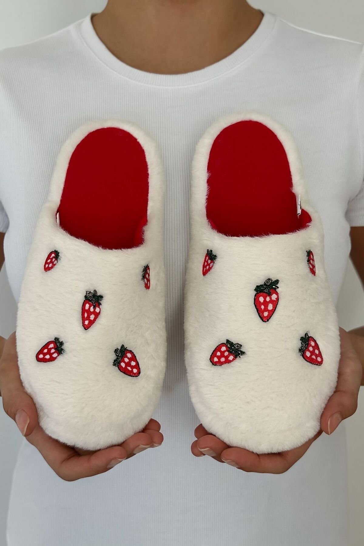 Çilek Nakışlı Pofuduk Ev Terliği Çeyizlik Terlik Kaymaz Taban STC1145