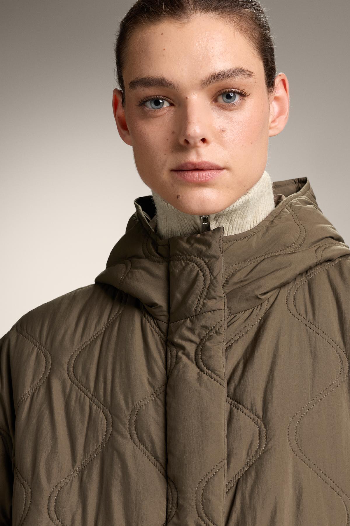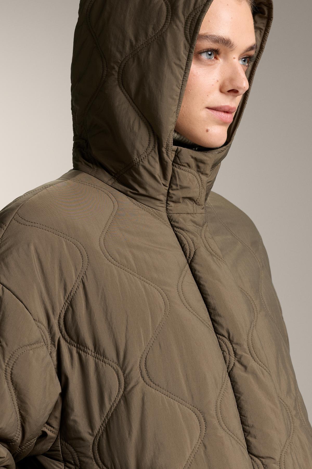 Kapüşonlu, balıkçı yaka, fermuar ve düğme kapamalı uzun dolgulu ceket.