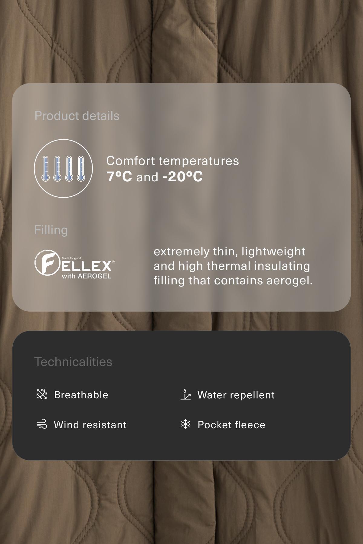 FELLEX® AEROGEL teknolojisi, polyesterden yapılmıştır ve giysiye ekstra ağırlık katmadan termal yalıtımı artırmayı sağlayan AEROGEL bileşenini içerir.