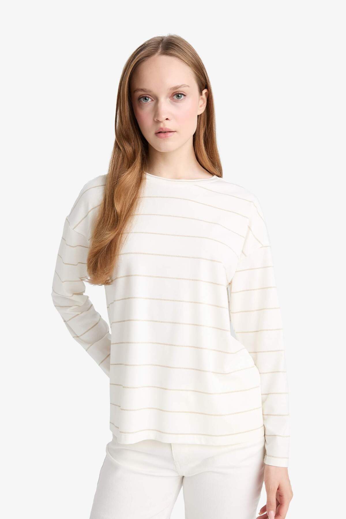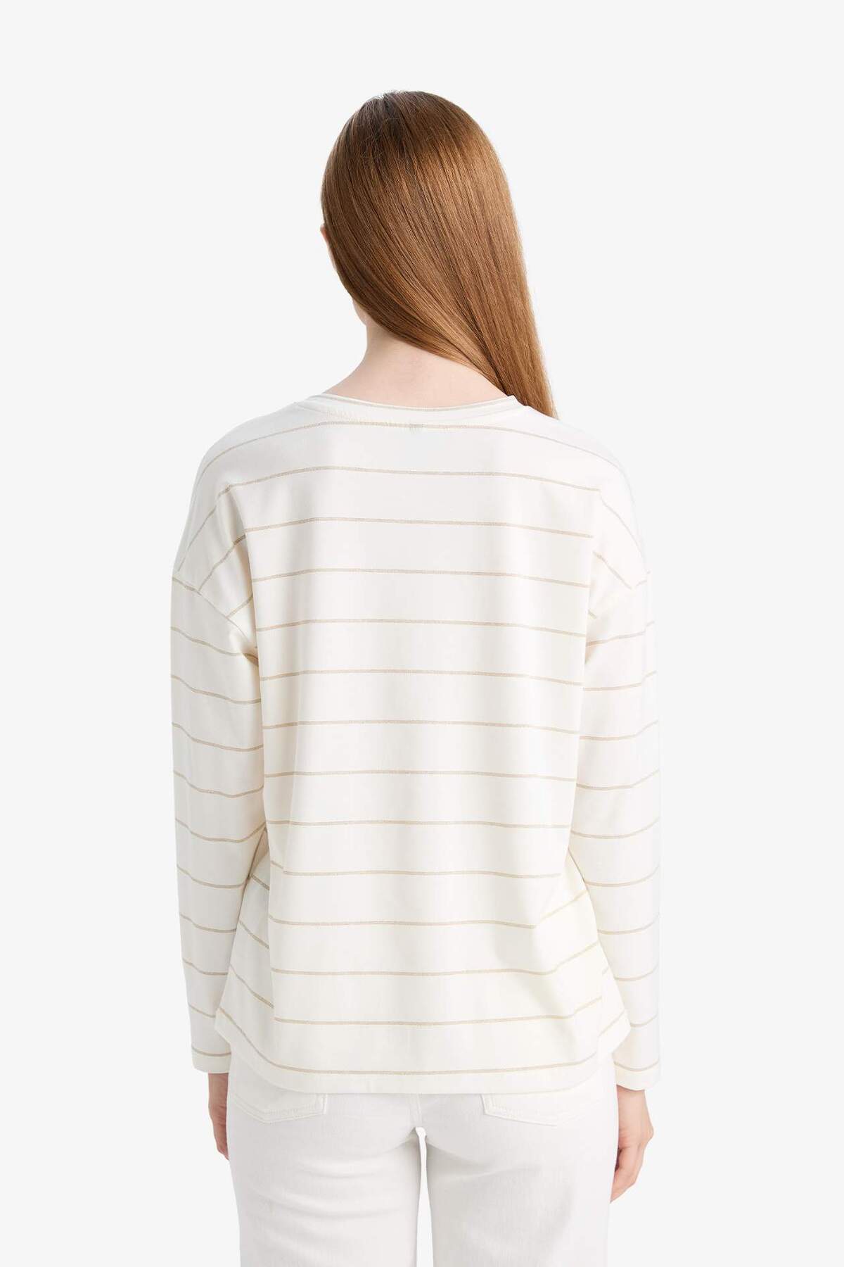 Relax fit kesimi ve çizgili deseniyle dikkat çeken bu bisiklet yaka uzun kollu tişört, rahat kumaşıyla gün boyu konfor sağlar.