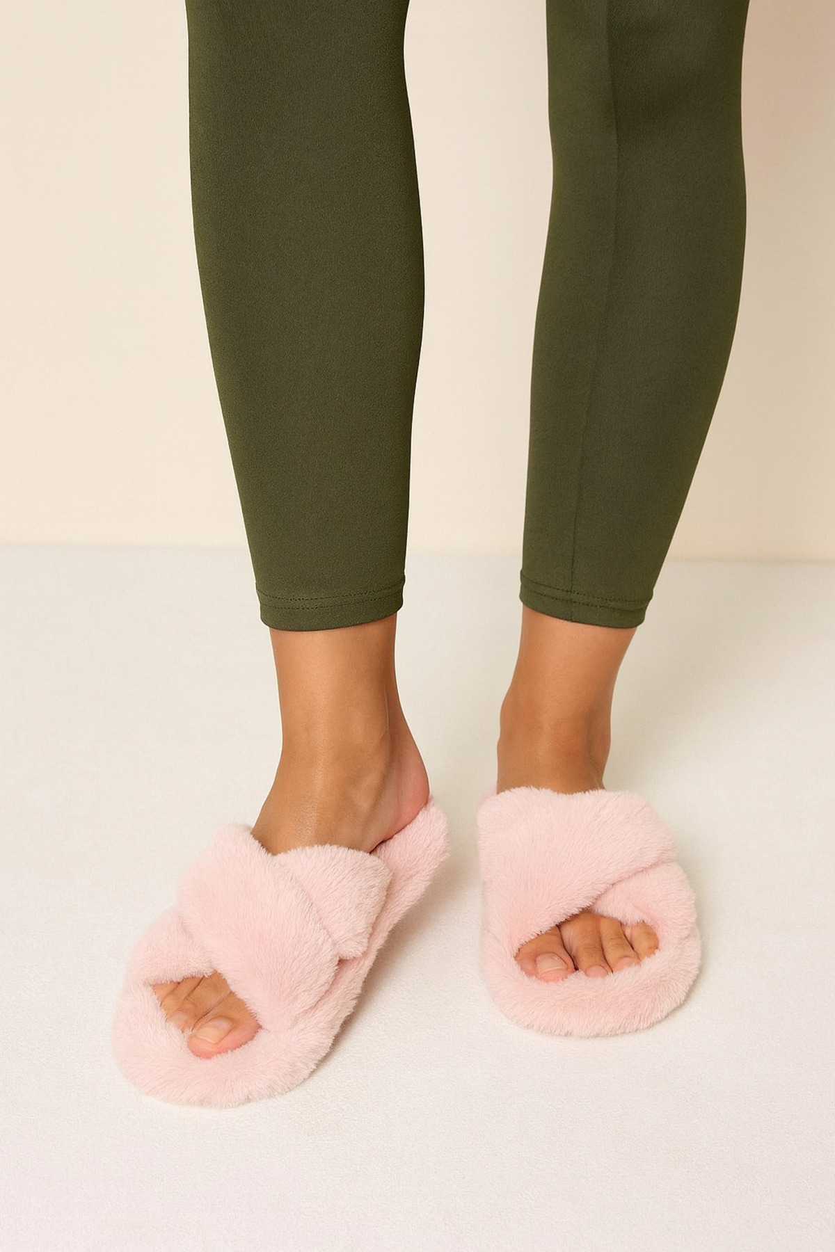 Kadın Pudra Çapraz Bantlı Tüylü Ev Terliği BYNDCAP01
