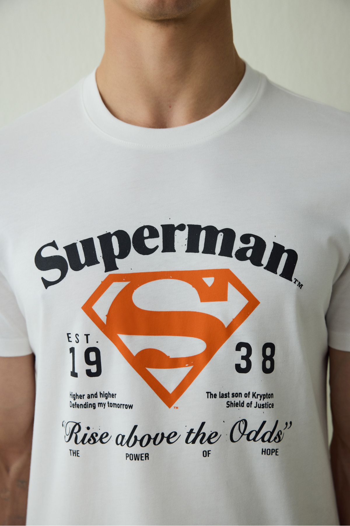 Lic-Superman Pant Set, beyaz zemin üzerine lisanslı Superman kısa kollu üst ve Superman logosu baskılı alt pijama setidir.
