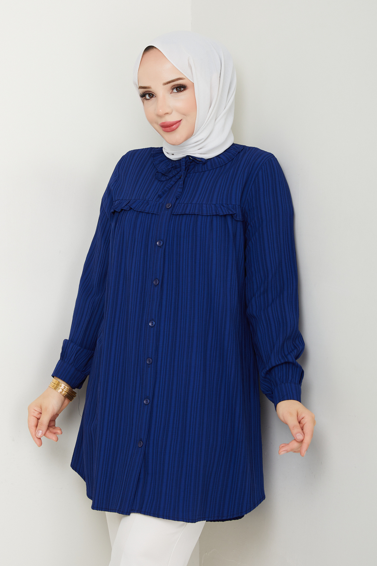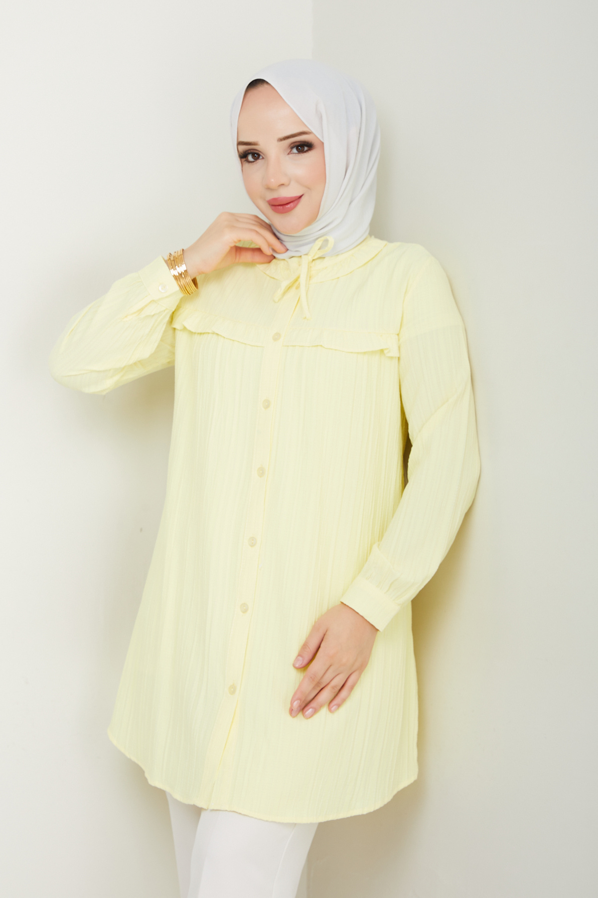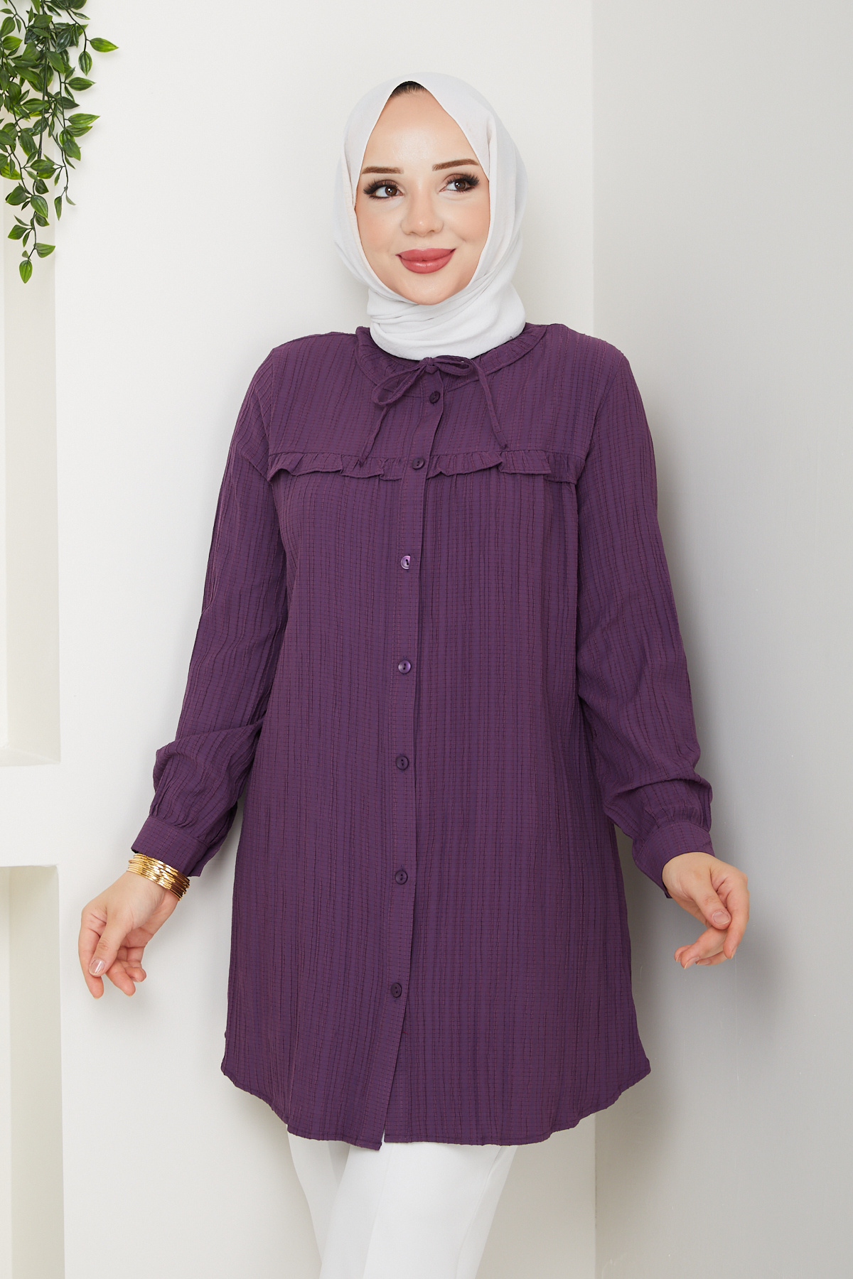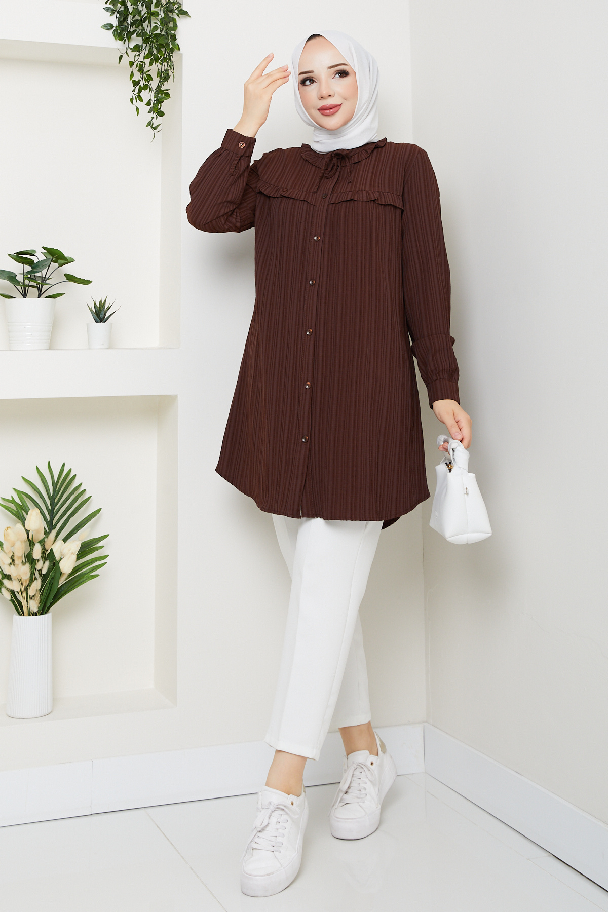 Kadın Yaka Detaylı Fırfırlı Robalı Gömlek Acı Kahve