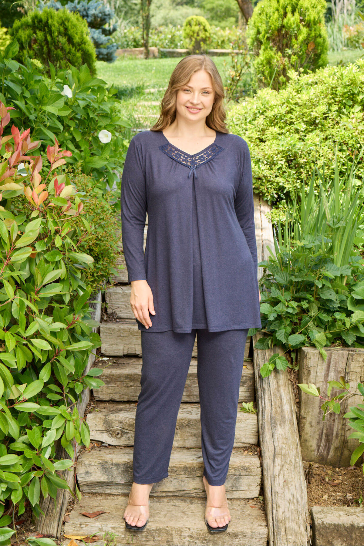 Üst kısmı dantel detaylı tasarıma sahipken, alt kısmı lastikli uzun pijama ile tamamlanmıştır.