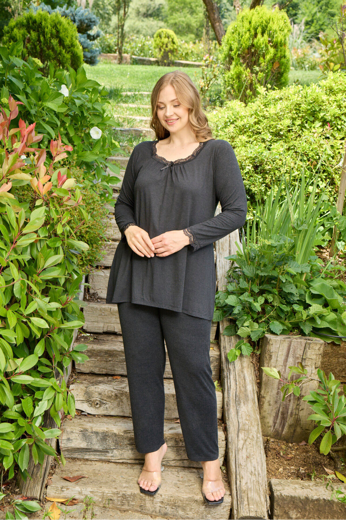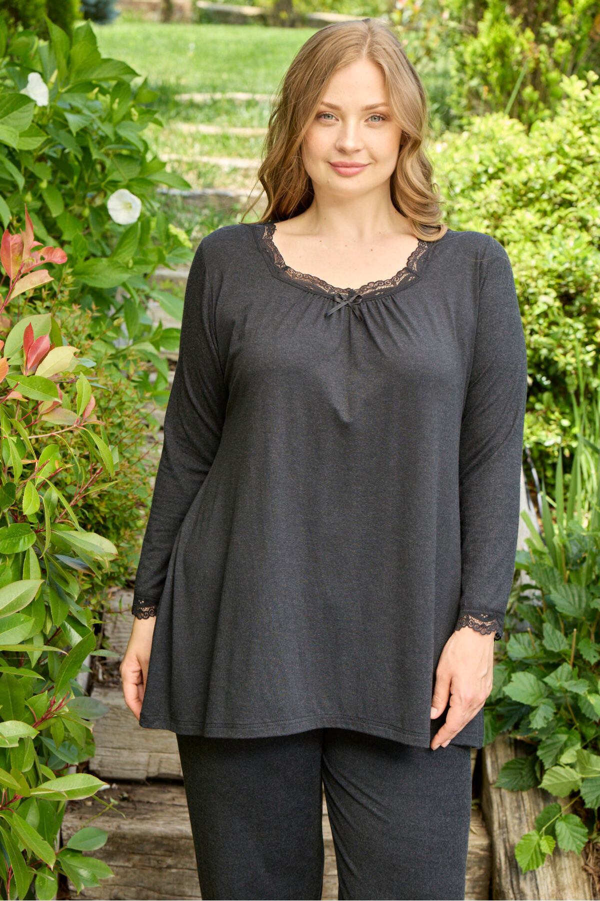 Yakası Dantel Detaylı Uzun Kol Yün Viskon Büyük Beden Tunik Pijama Takım •Dantel Detaylı Yün Viskon Uzun Kol Kadın Tunik Pijama Takımı, yüksek konfor ve şıklığı bir araya getirir.