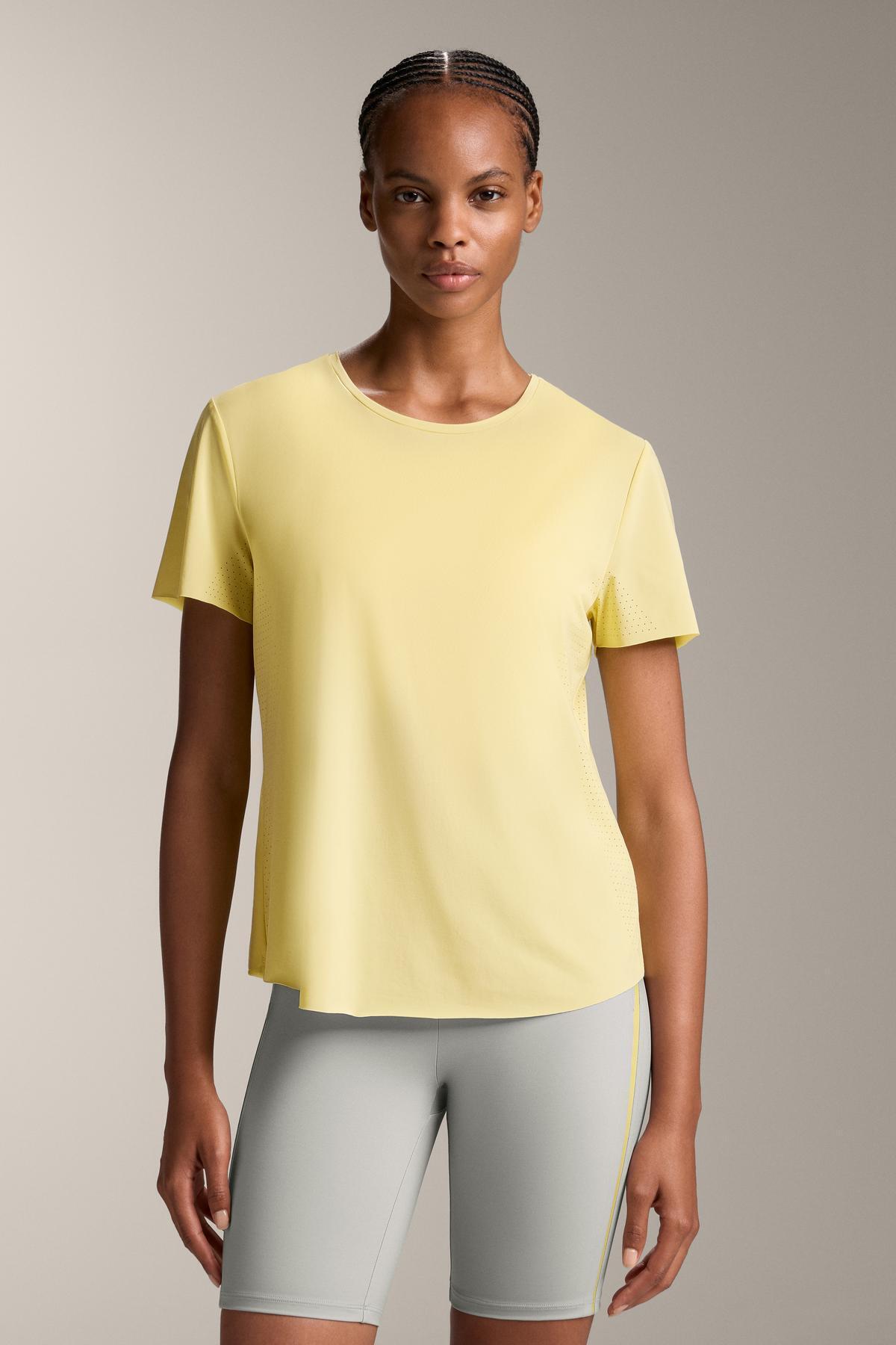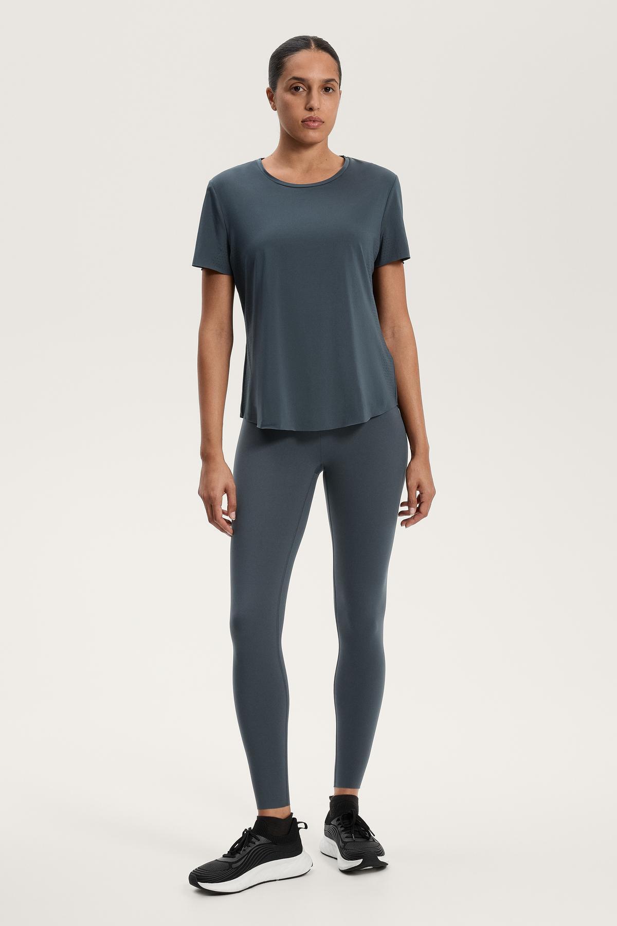 Teknik kumaşlı, kapalı yaka ve kısa kollu dar tişört.