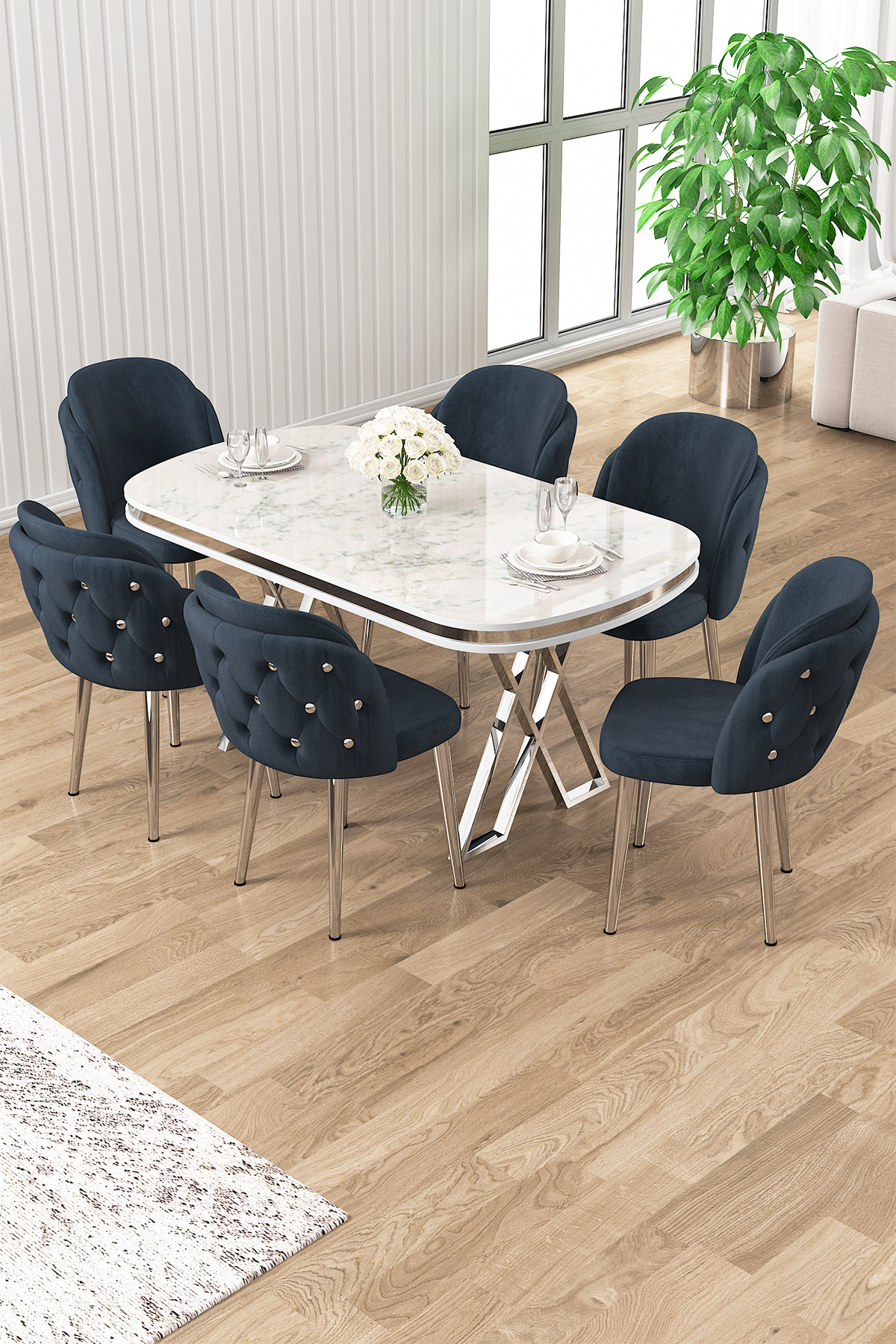 Ela Serisi Lak Panel Beyaz Mermer Desen Gold Ayak Mutfak Masa Takımı 6 Siyah Sandalye