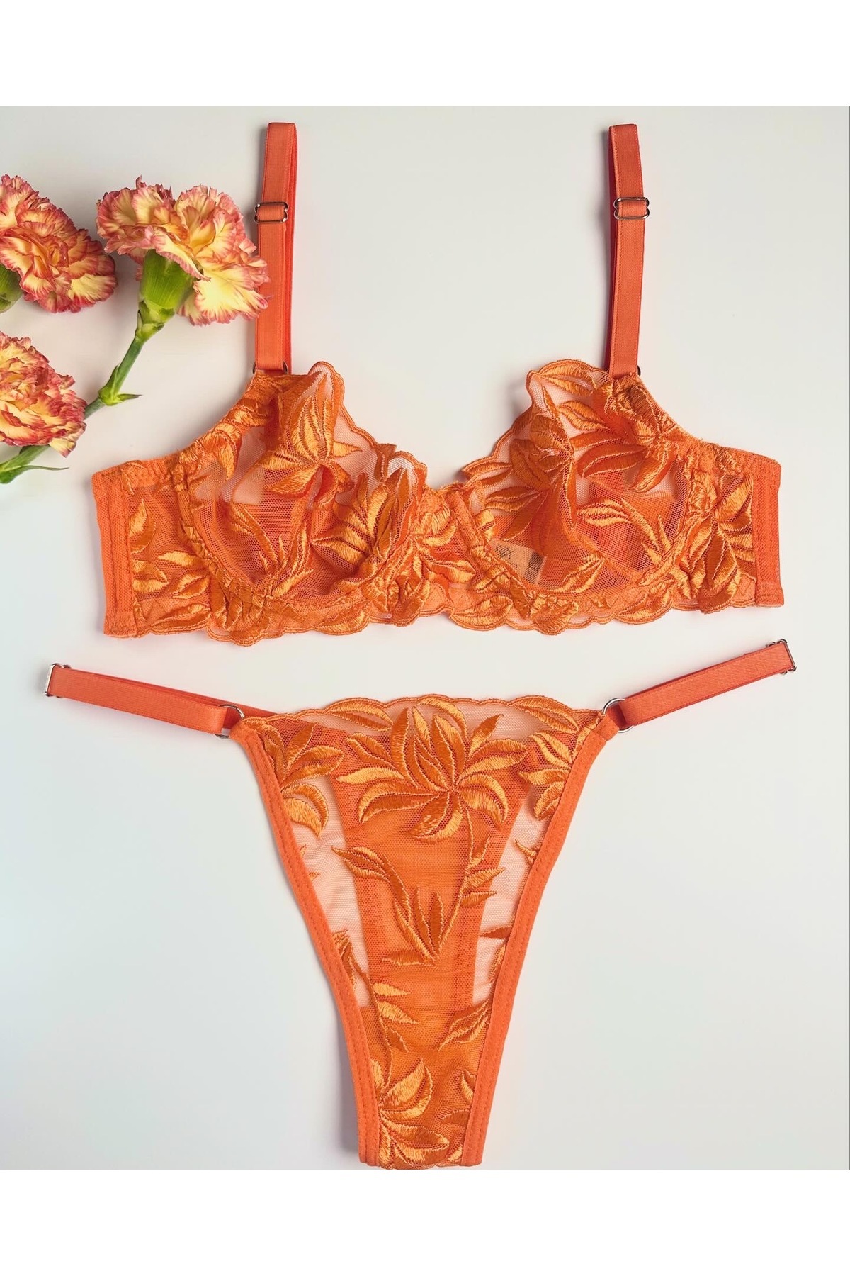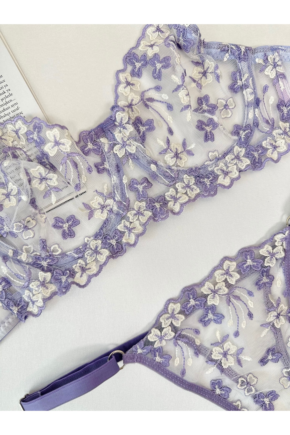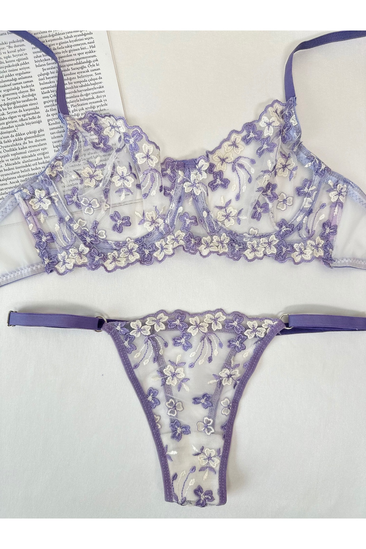 Zarif çiçek desenleriyle süslenmiş, göz alıcı bir görünüm sunan brode iç çamaşırı takımı.
