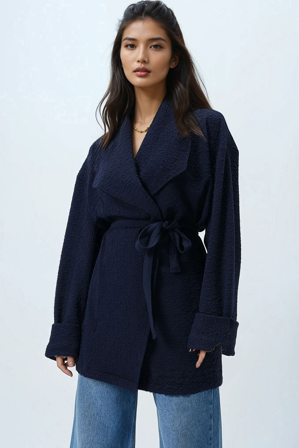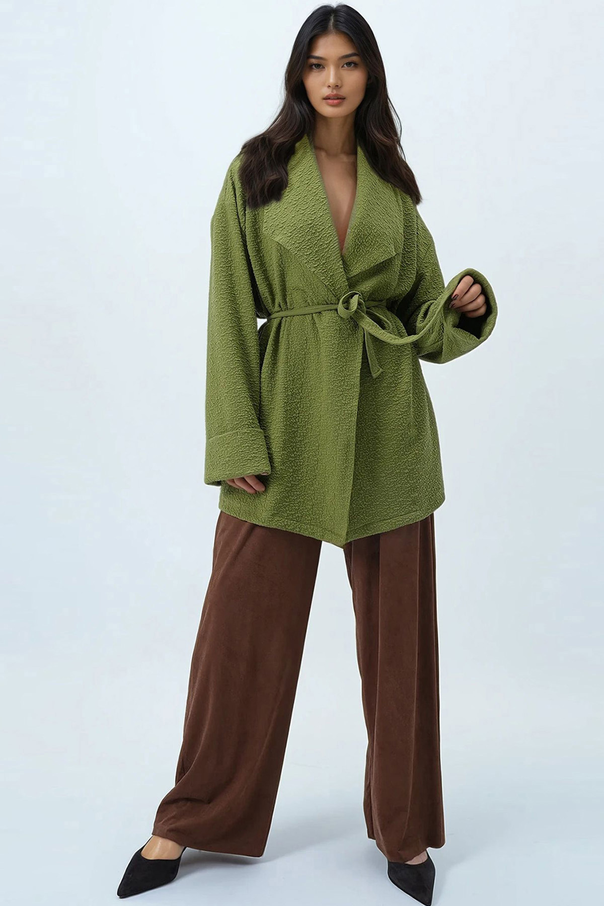 Zarif Şal Yaka Kesimiyle Öne Çıkan Bu Uzun Ceket, Kendinden Dokulu Kumaşı Sayesinde Sofistike Bir Görünüm Sunarken, Belden Bağlamalı Kemer Detayıyla Silueti Vurguluyor. Akışkan Formu Ve Sade Çizgileriyle Hem Şehirli Hem Modern Bir Duruş Sergileyen Bu Parça, Katmanlı Kombinlerde Güçlü Bir Tamamlayıcı Olarak Öne Çıkar. Günlük Stilinize Dokulu Şıklık Ve Dengeli Bir Zarafet Katmak İsteyenler İçin İdeal Bir Seçim.