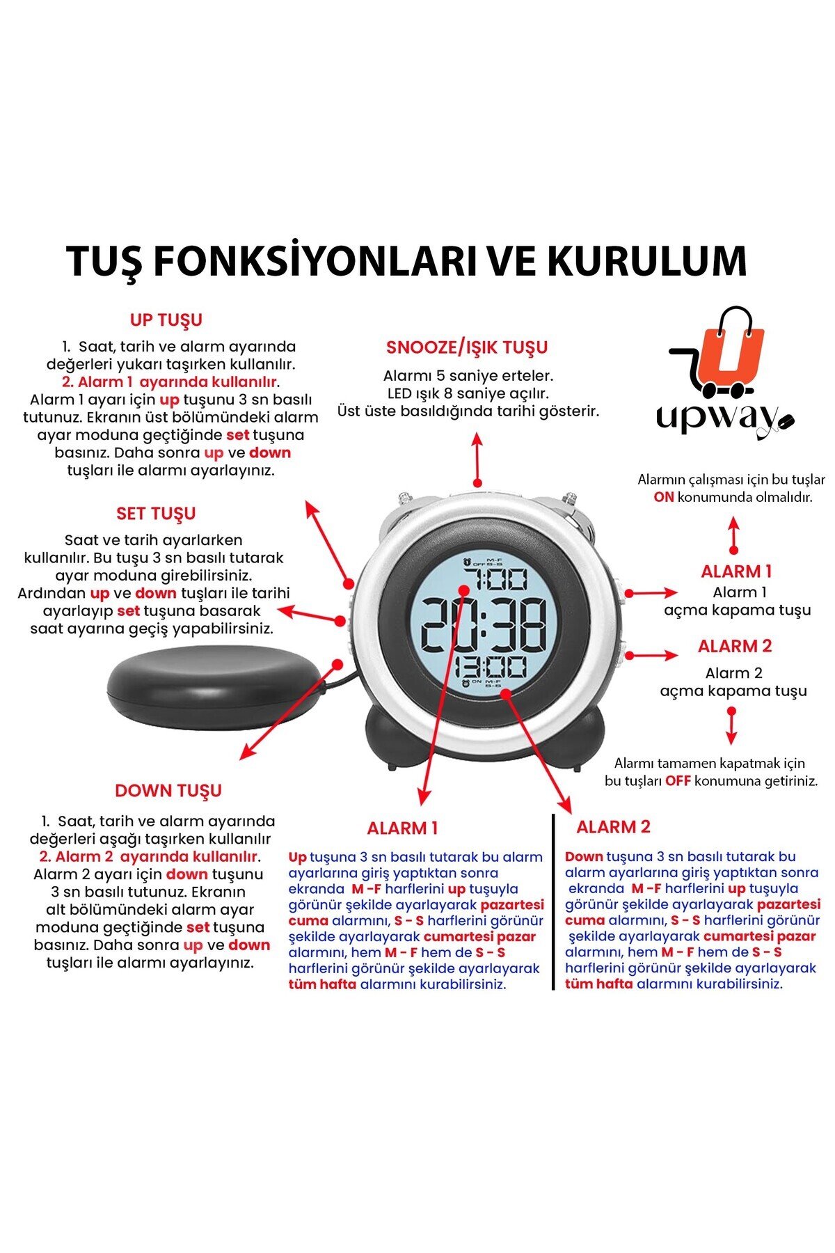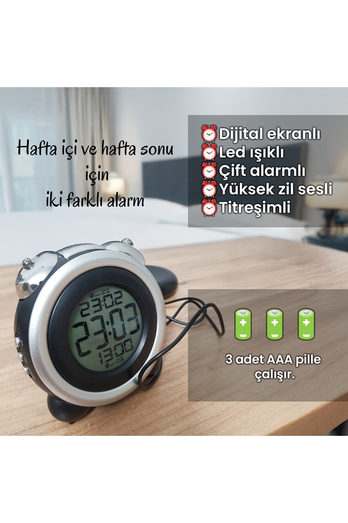 Çift Alarmlı Titreşimli Yüksek Zil Sesli Tarih Göstergeli LED Işıklı Dijital Masa Saati