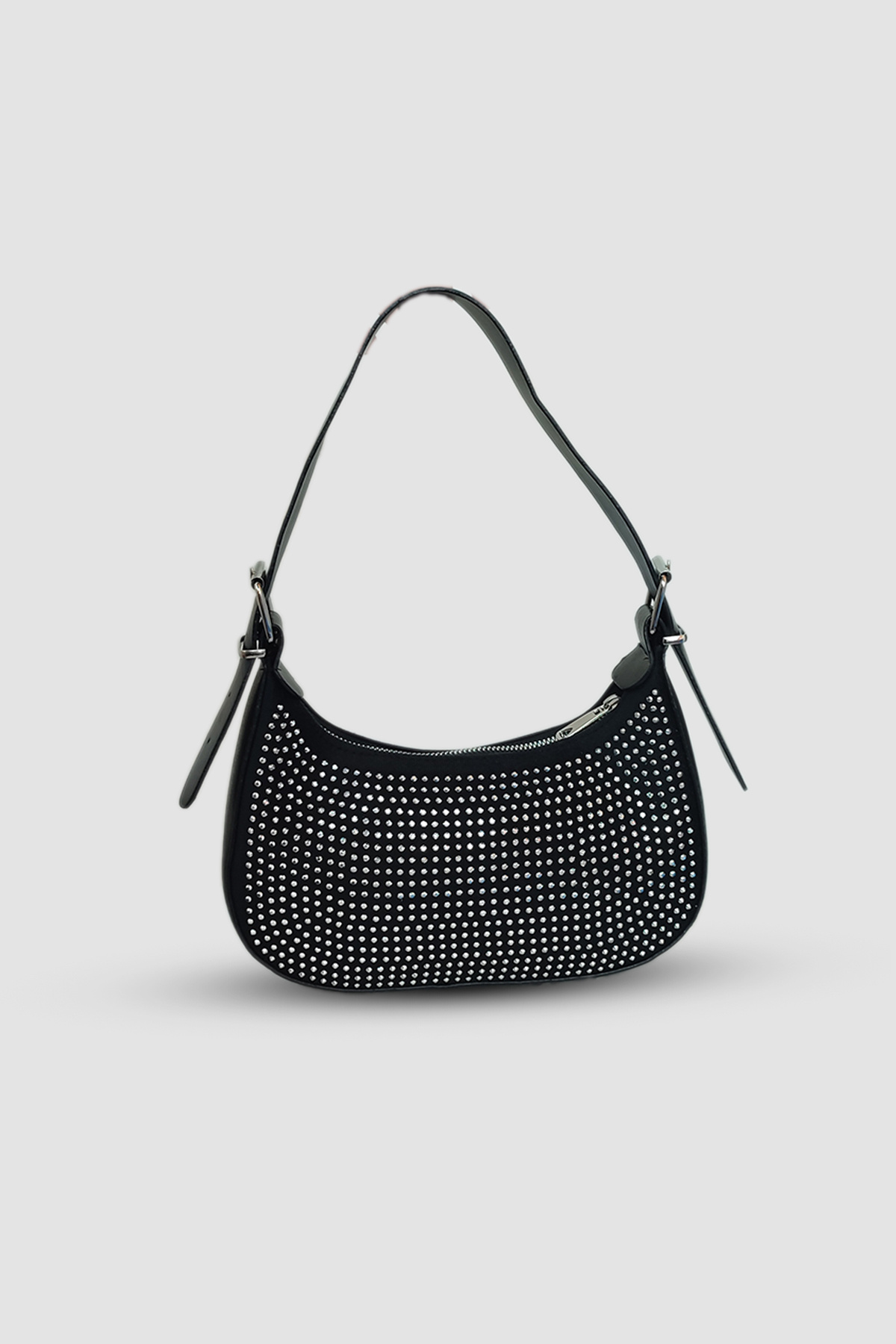 - Şıklığı ve zarafeti bir arada sunan siyah taşlı omuz çantası, parti ortamlarında göz alıcı bir aksesuar olarak öne çıkar.