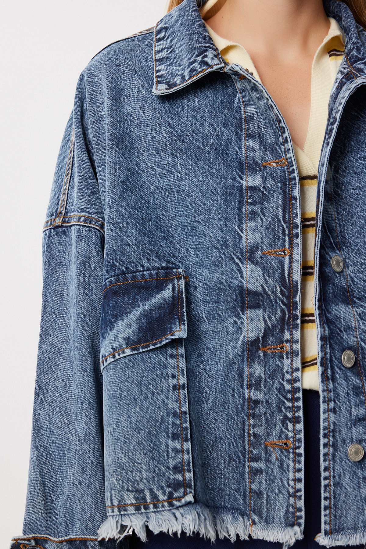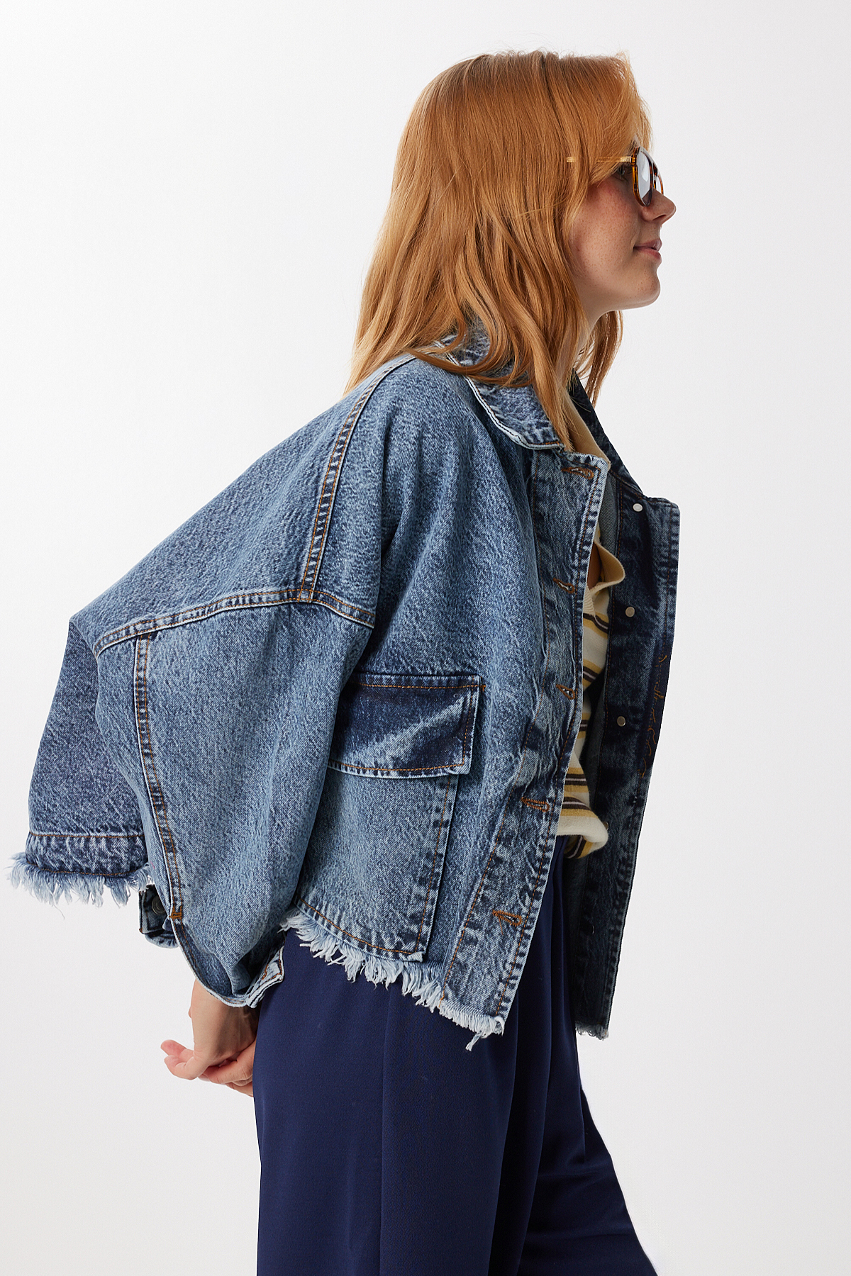 Polo yaka, metal düğme kapamalı, düşük omuzlu, kapaklı cepli, yıkamalı, püsküllü denim ceket