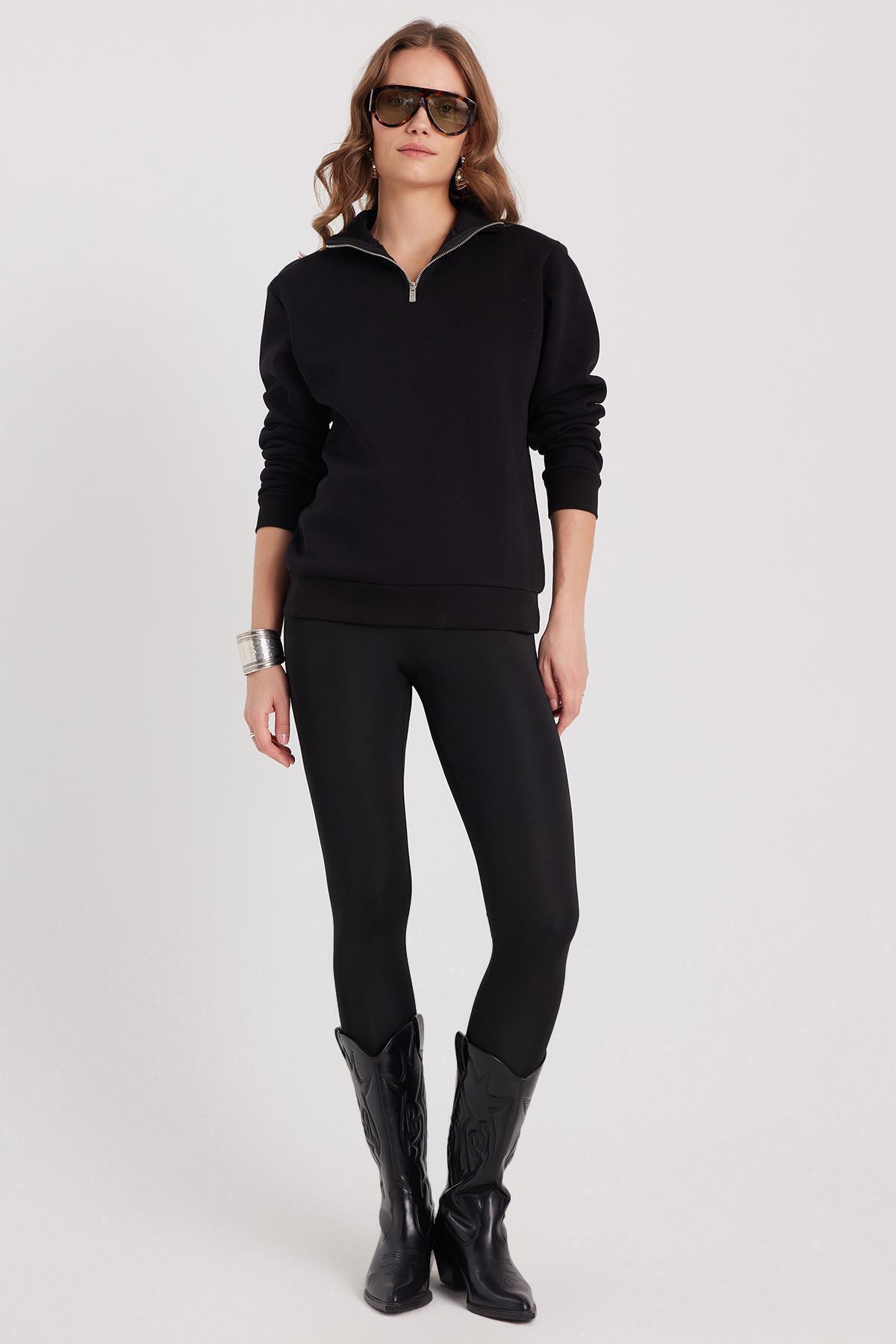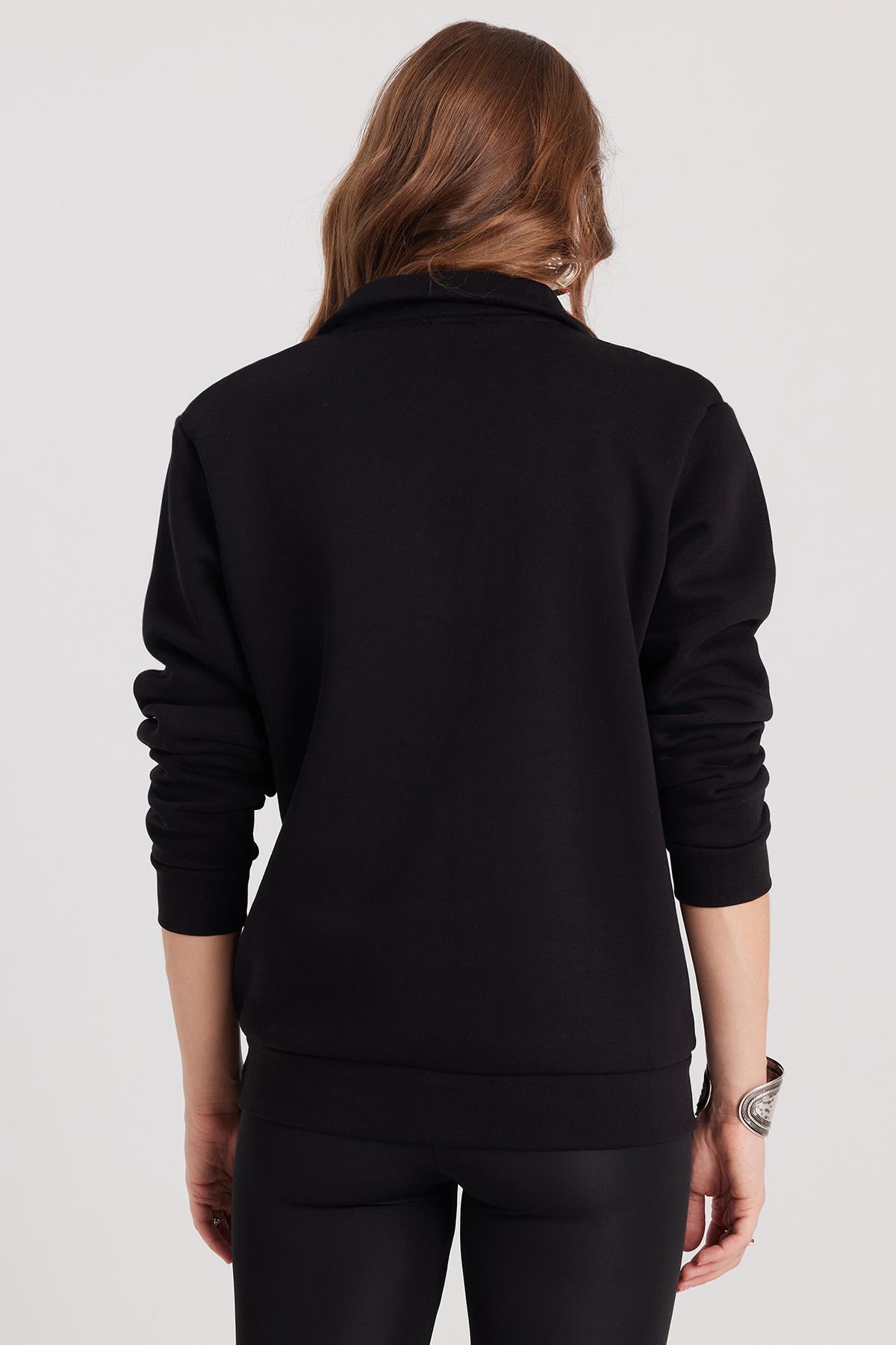 Kadın Relax Fit Rahat Kesim Pamuklu İçi Polarlı Yarım Fermuarlı Siyah Dik Yaka Sweatshirt