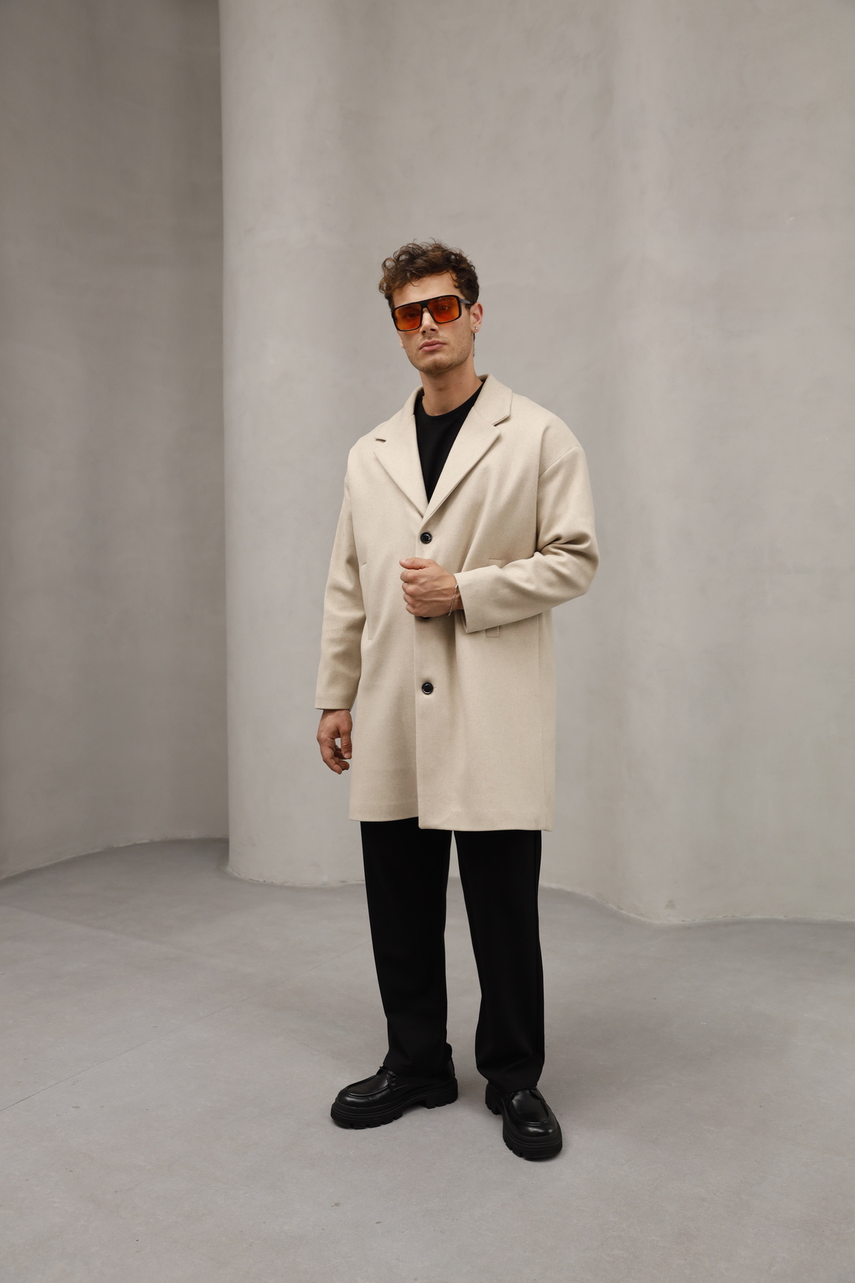 Krem/Bej Renk Düğme Kapamalı Renk Yarım Oversize Rahat Kesim Uzun Erkek Kaşe Kaban Palto
