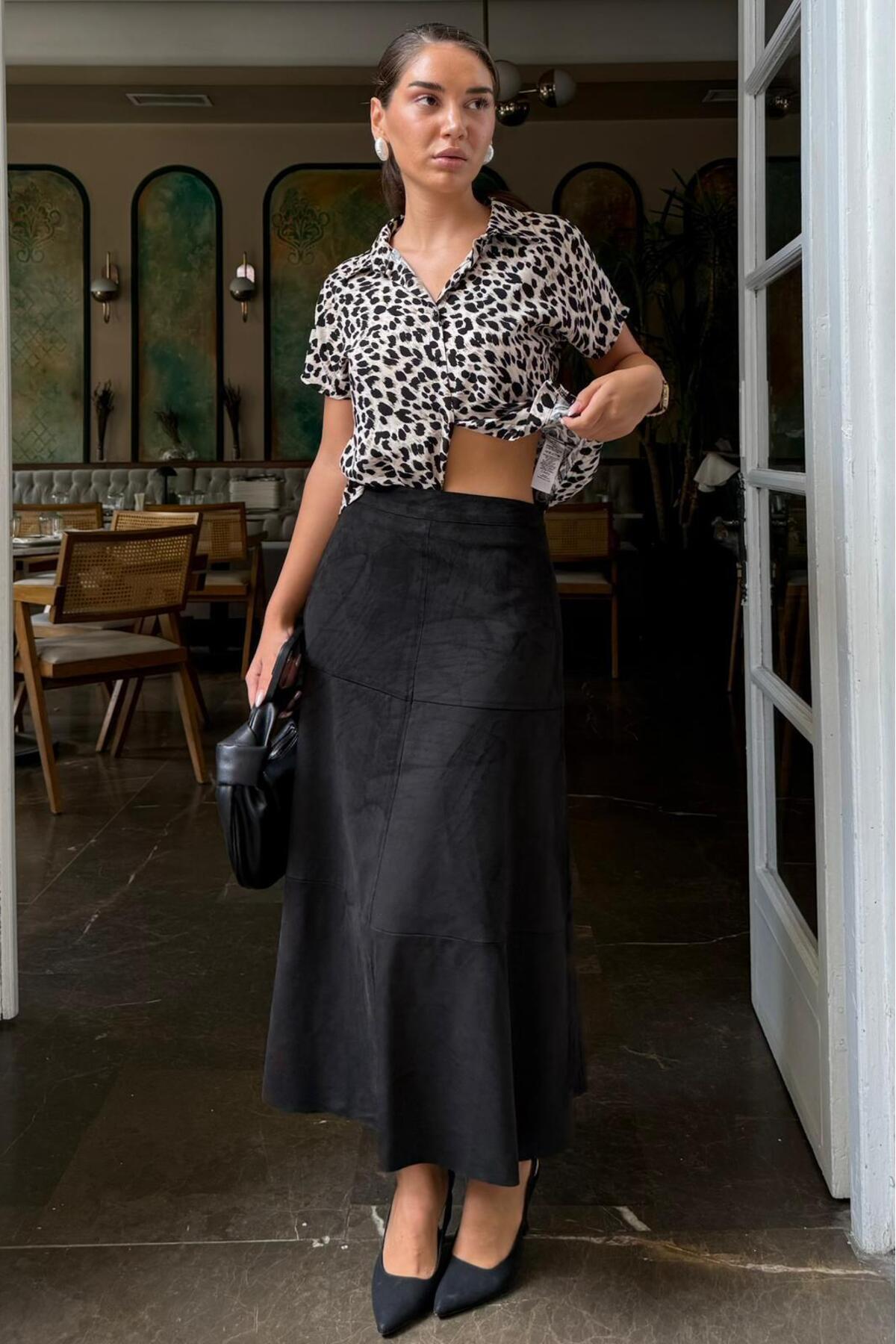 - Zarif kahverengi tonlarında, dokuma süet malzemeden üretilmiş uzun etek.