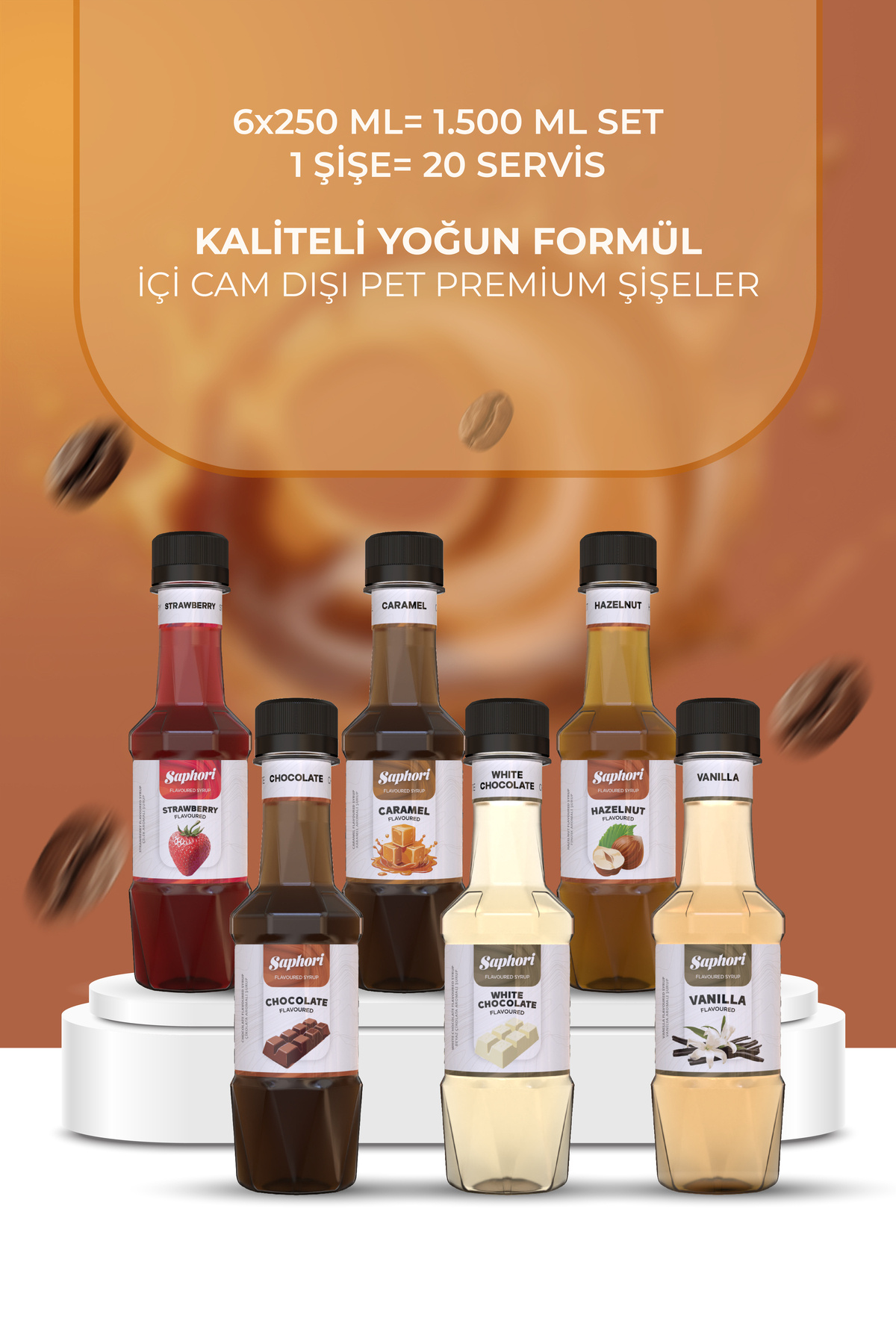 - 6'lı set halinde sunulan aromalı kokteyl şurupları, her bir şişe 250 ML kapasiteye sahiptir ve kahve şurubu olarak da kullanılabilir.