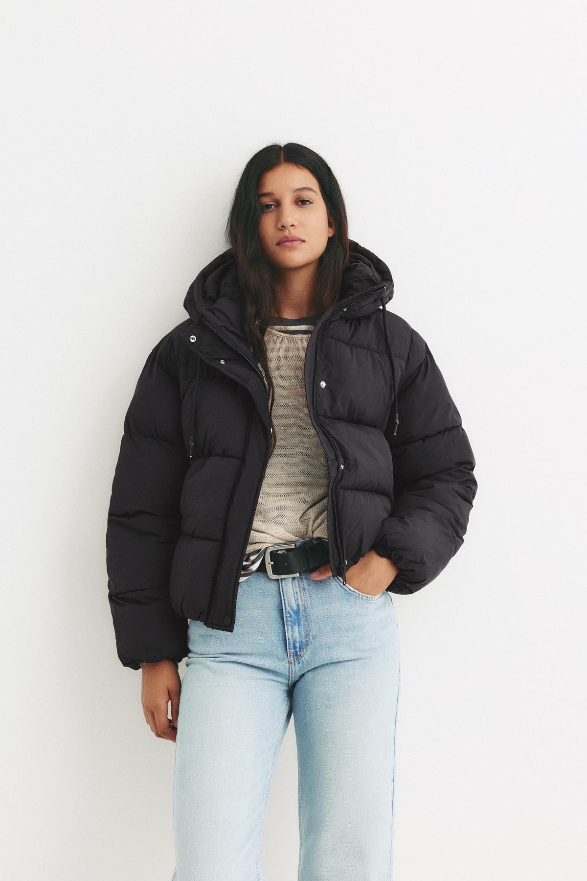 Kısa, dik yaka, kapüşonlu, fermuarlı, cepli ve uzun kollu şişme ceket.