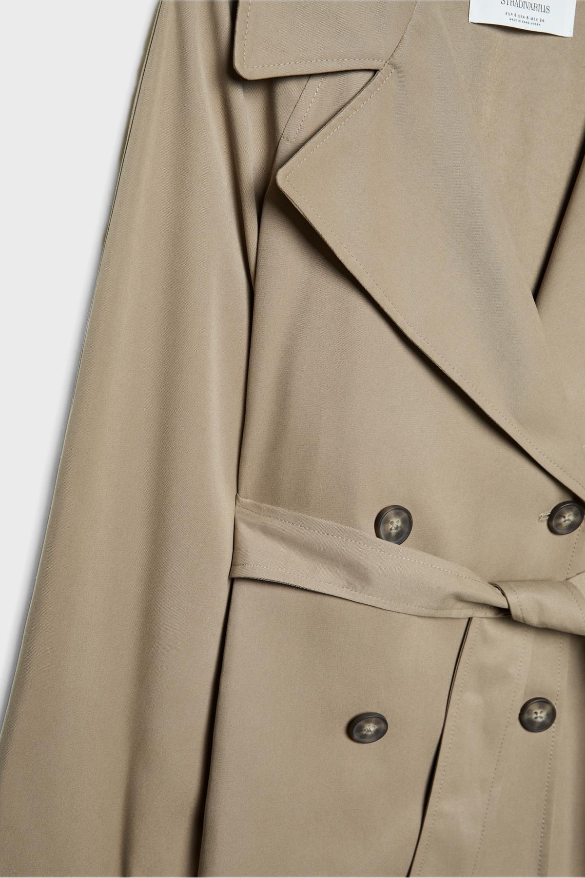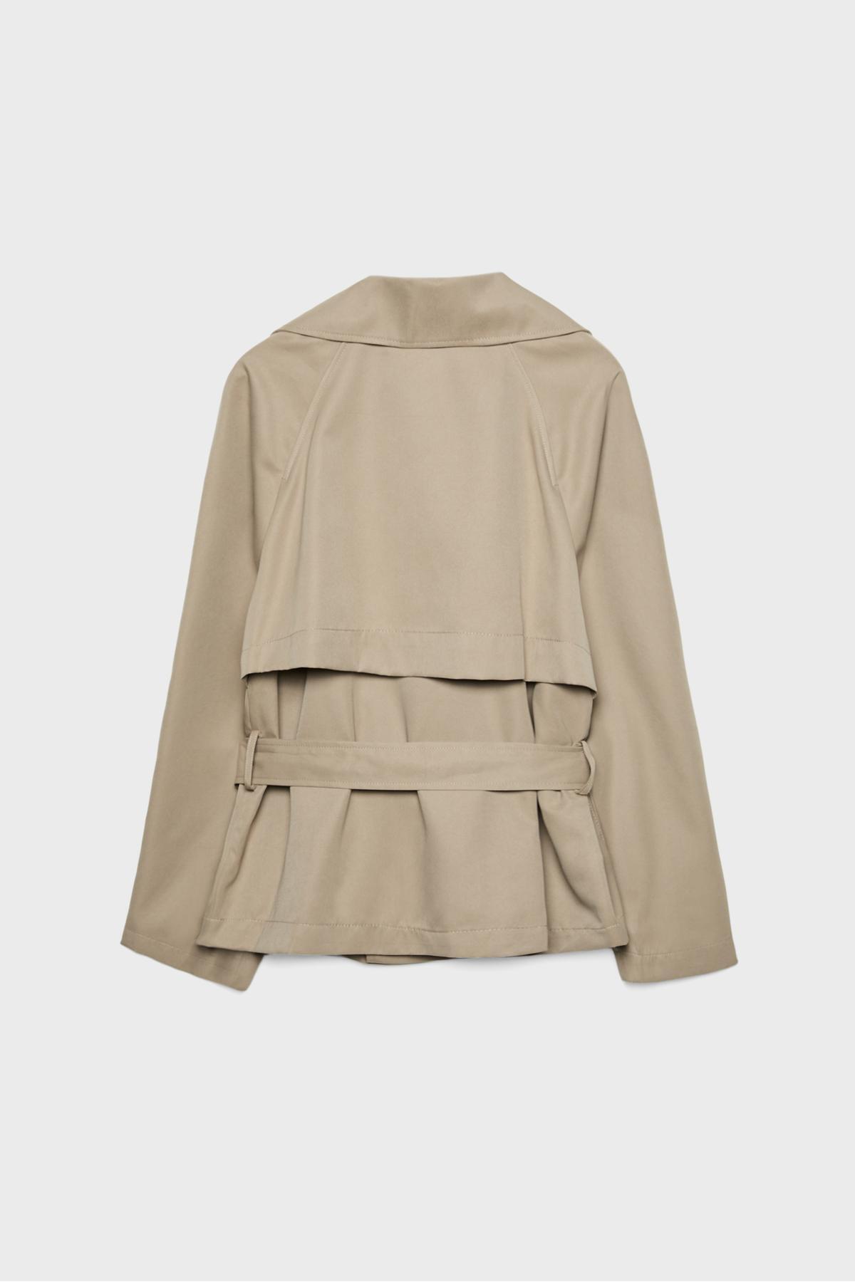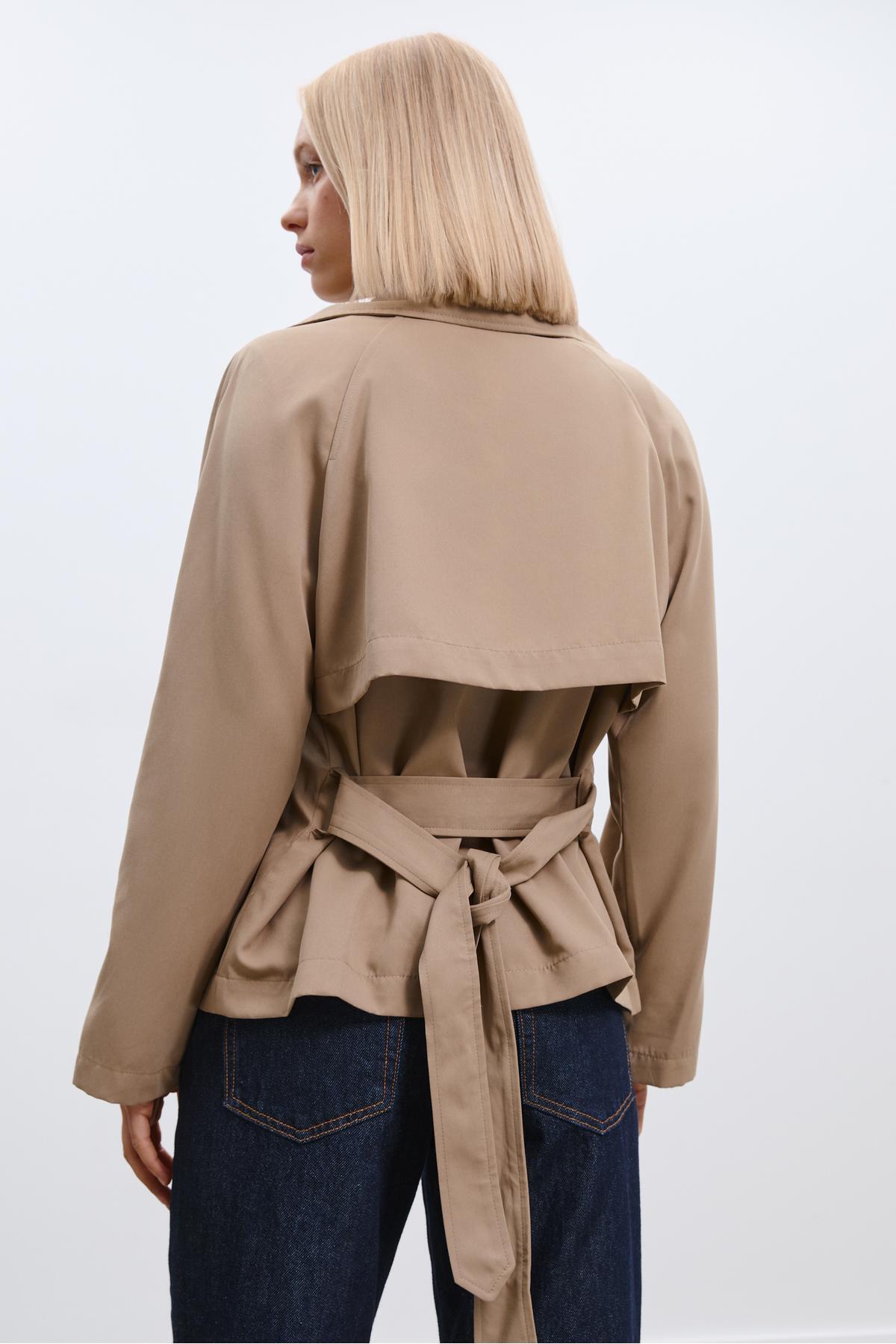 Yakalı ve uzun kollu kısa dökümlü trençkot.