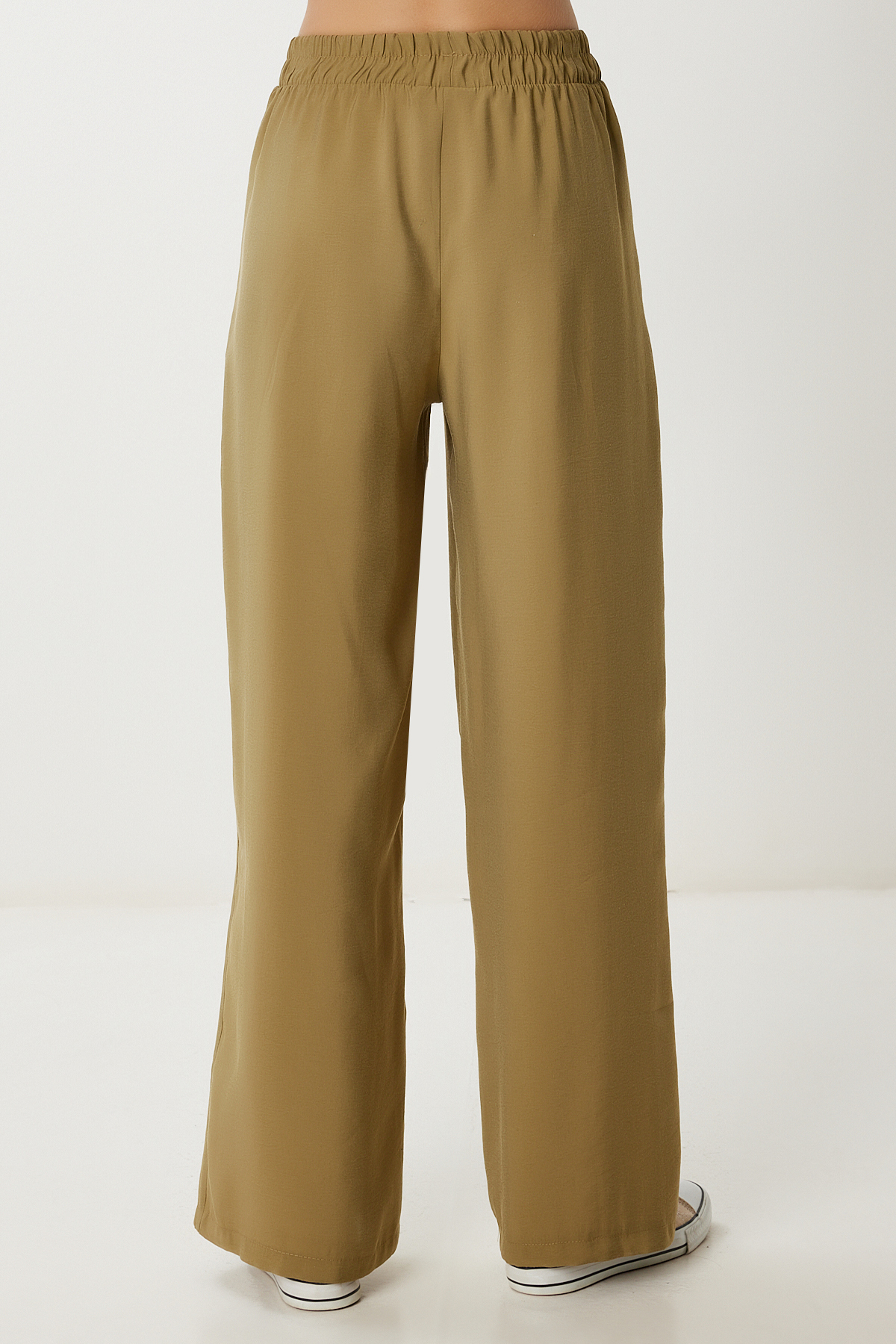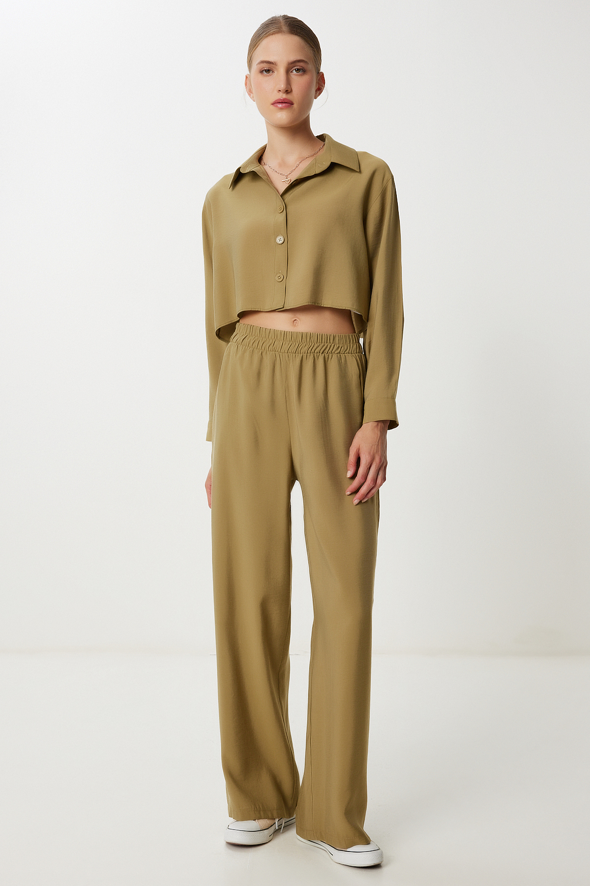 Düğme kapamalı, düşük omuzlu crop gömlek veelastik bel, yan cepli, geniş paça pantolon takım