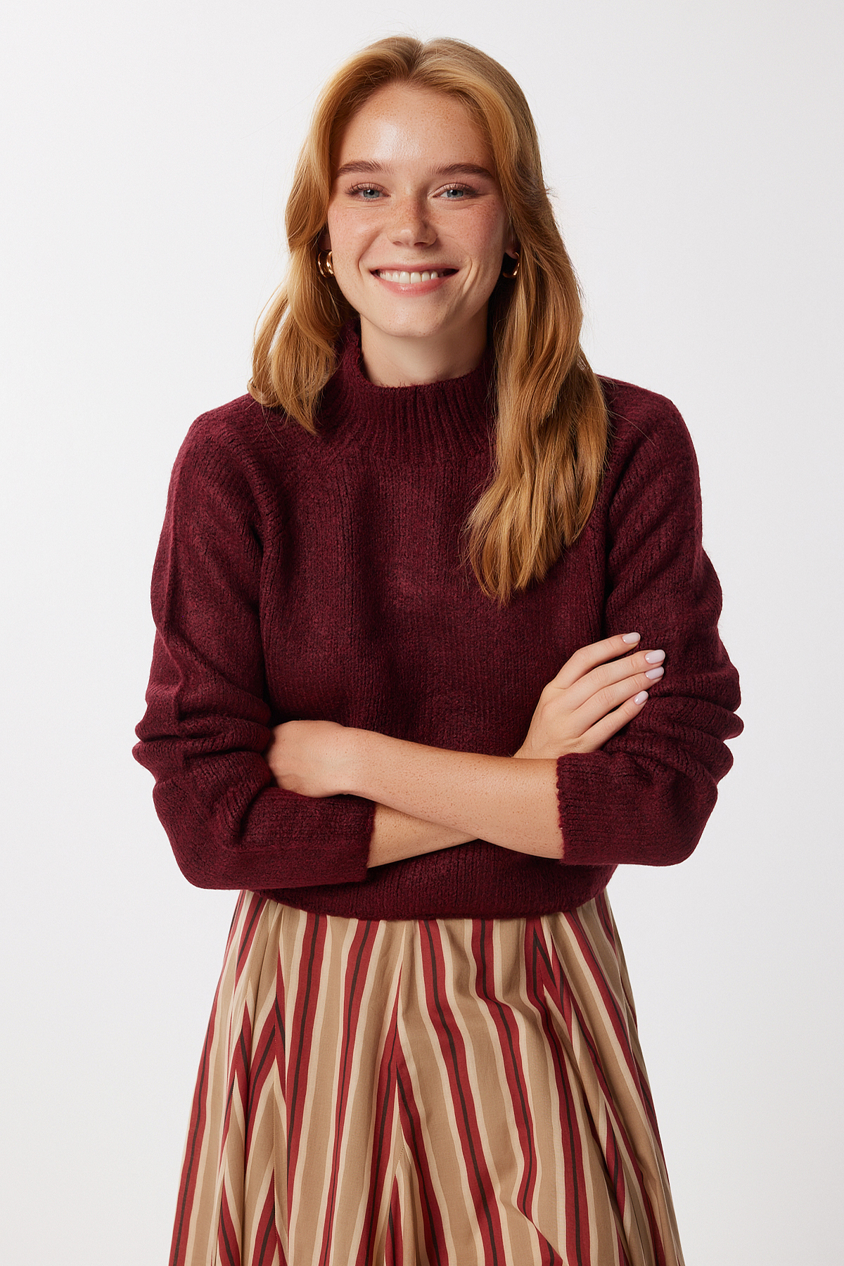 Dik yaka, esnek yapılı, basic, crop triko kazak
