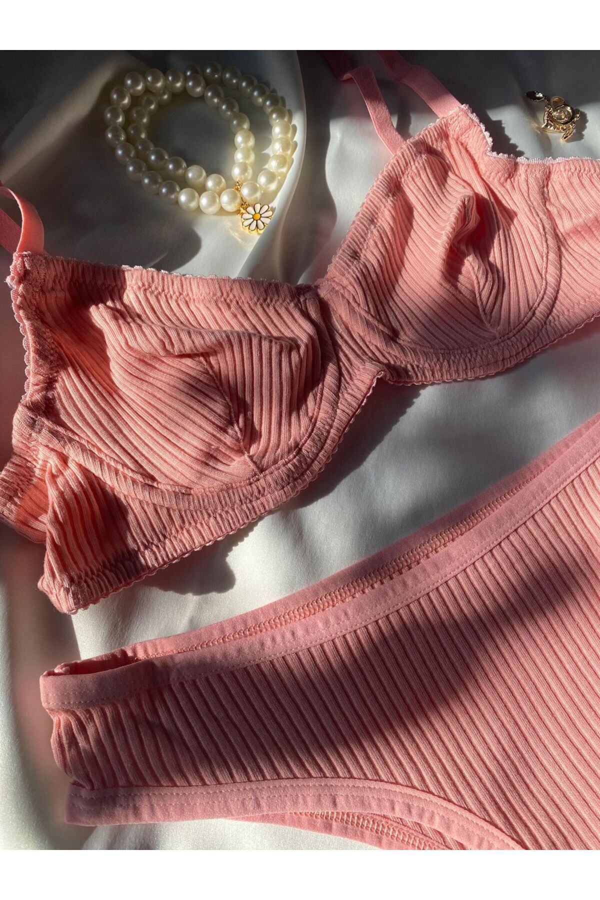 Mavi pamuklu ribana dokulu balenli sütyen & külot takımı, esnek kumaşıyla vücudu sarar, gün boyu rahatlık ve estetik bir görünüm sağlar