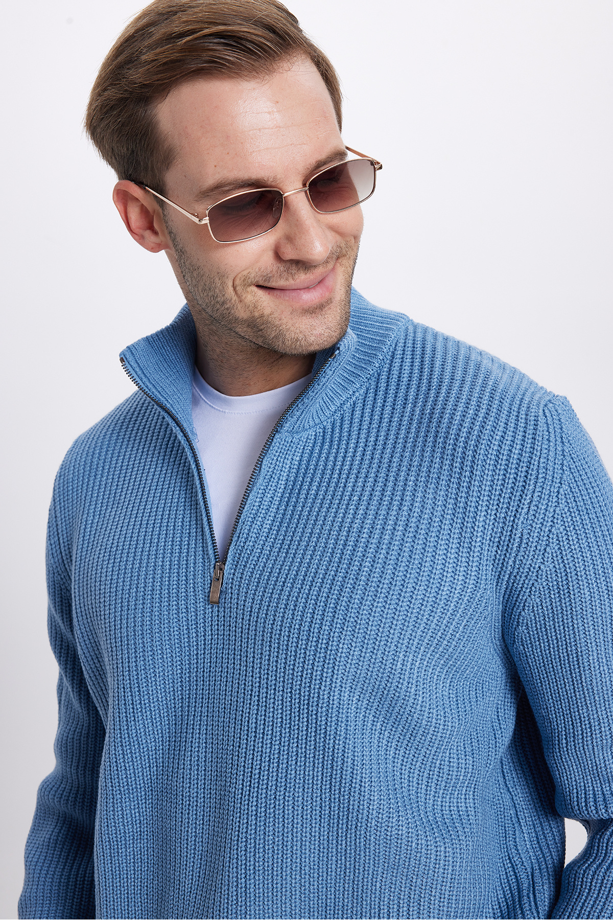 Erkek Slim Fit Dar Kesim Fermuarlı Kahverengi Dik Yaka Triko Kazak